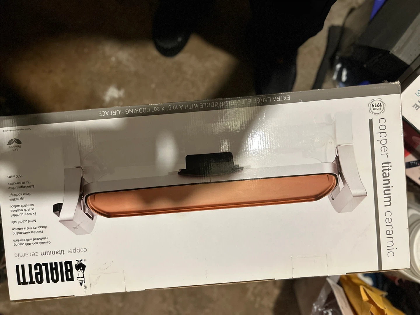Selling a Bialetti copper titanium ceramic electric griddle. It has an extra large cooking surface of 10.5" x 20", perfect for making a lot of pancakes! The ceramic non-stick coating is reinforced with titanium for outstanding durability and resistance. It's also metal utensil safe and scratch-resistant. The box says it's up to 30% faster cooking and can fit 10 pancakes!