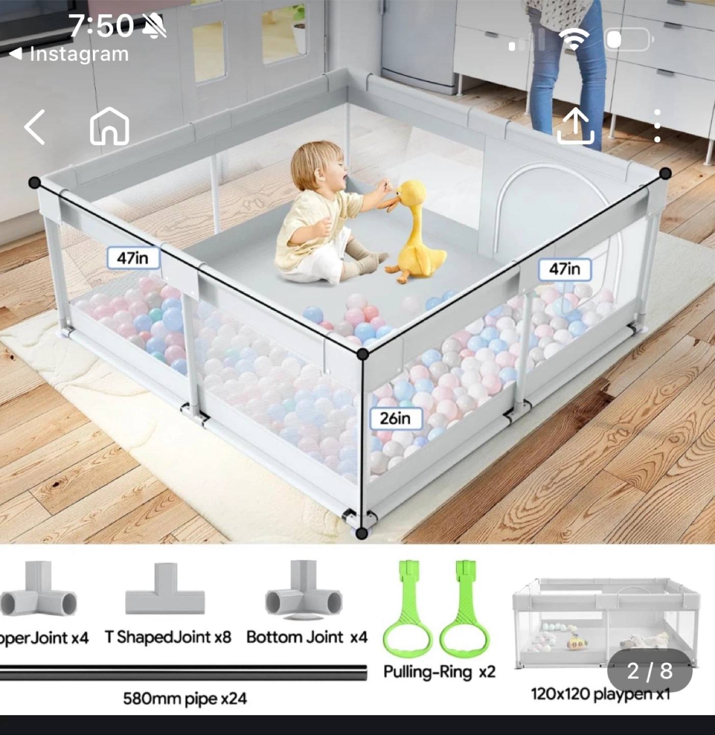 Selling a baby playpen that's in great condition! It measures 47 inches by 47 inches and is 26 inches tall. Includes the upper joints, T shaped joints, bottom joints, pulling rings, and pipes!