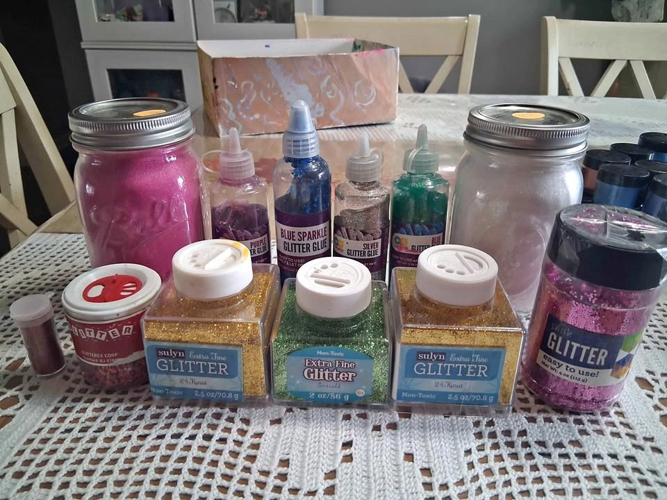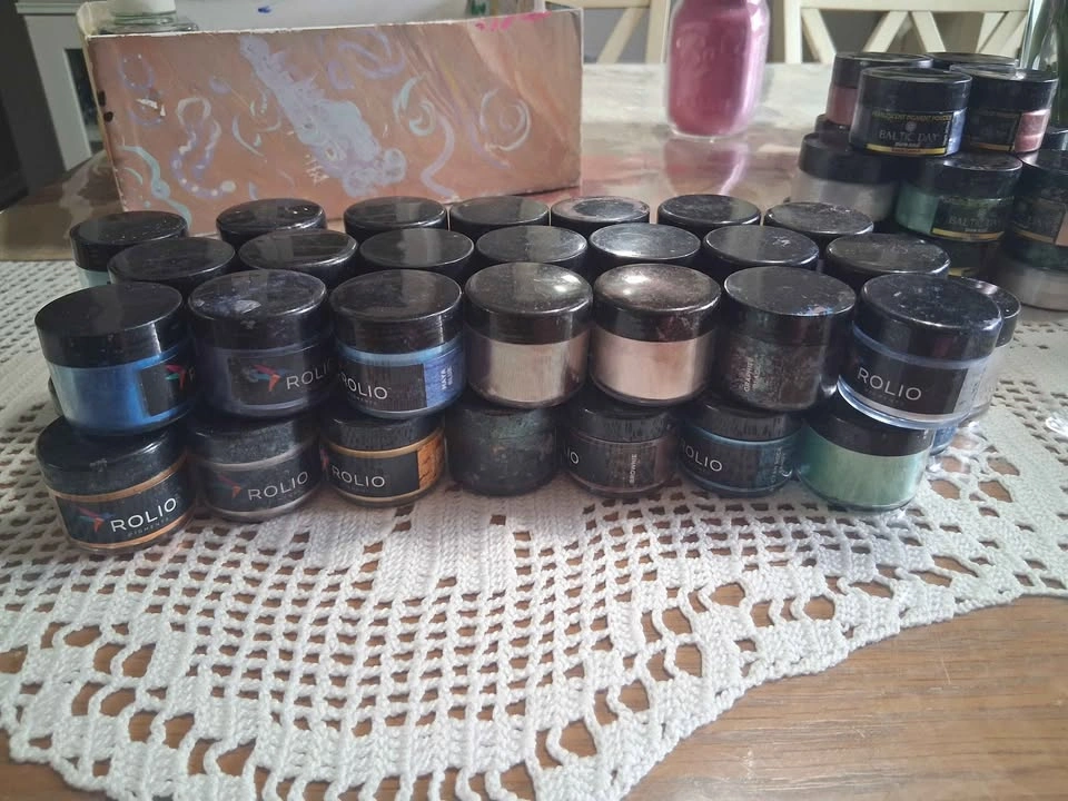 15Jars of glitter, glitter glues, 45 jars of Rolio pigment powder, 18 jars of Baltic Day pearlescent pigment powder