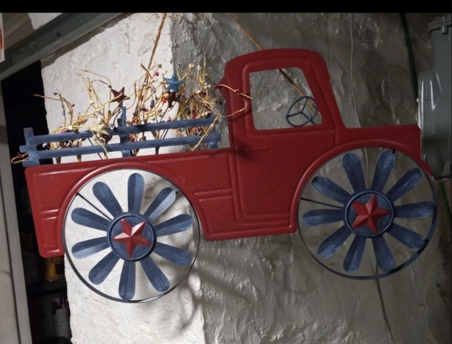 15Rustic metal truck wall art. Features flower-shaped wheels and a bed filled with faux greenery and stars. Perfect for farmhouse or Americana decor.