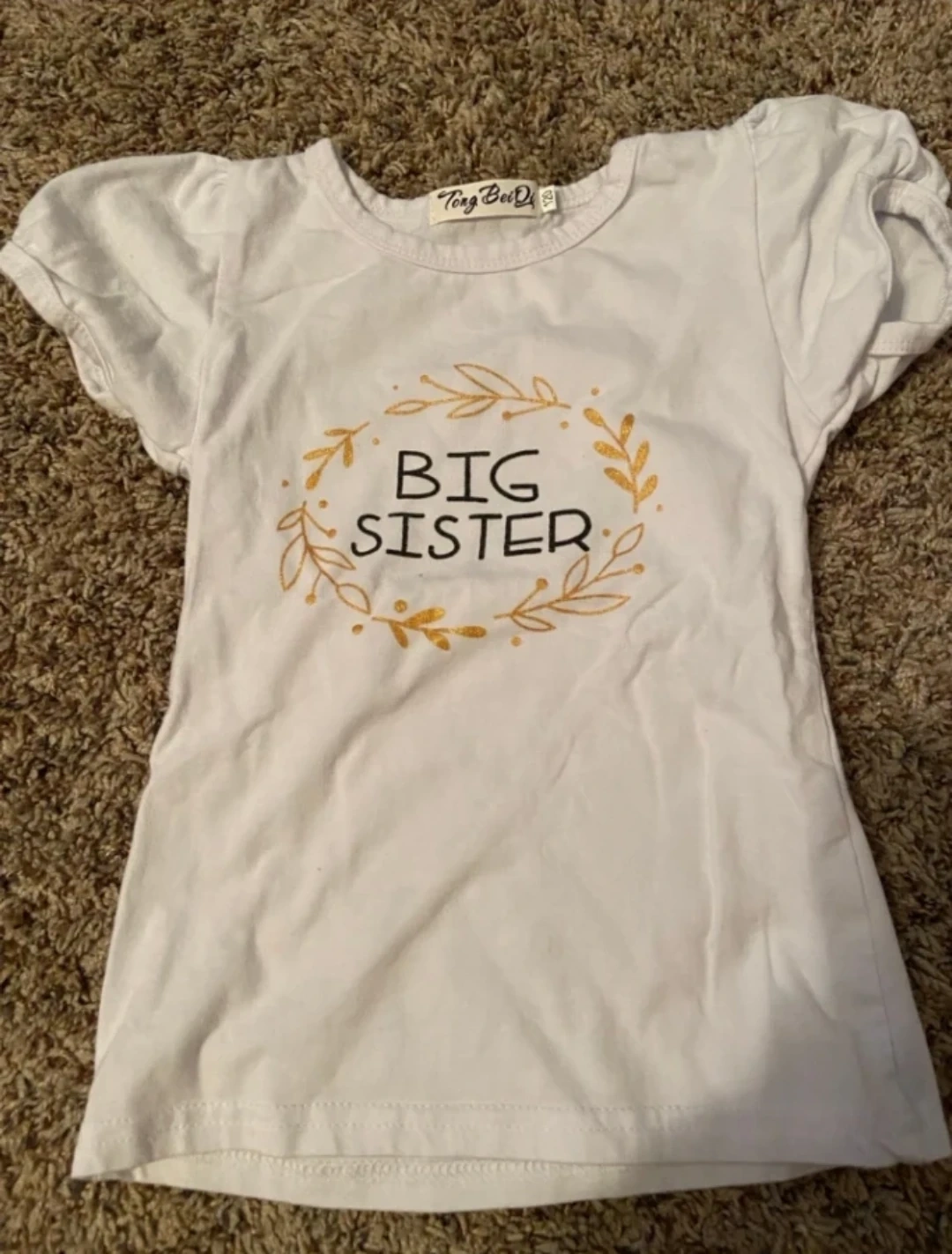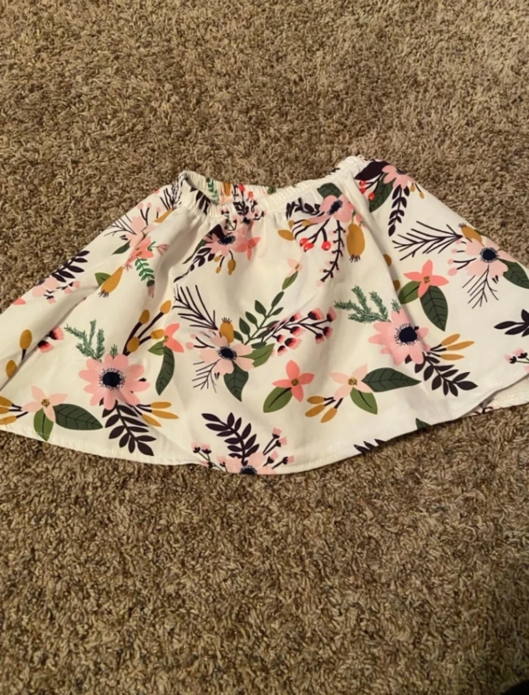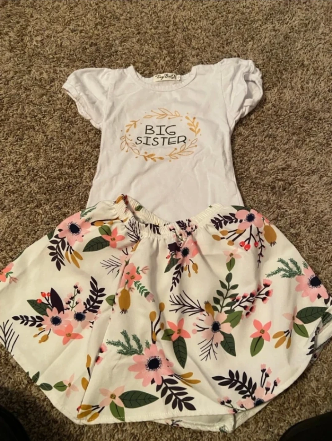 28Cute outfit with a Big Sister top and floral skirt! The top is white with a gold and brown design. The skirt has a floral pattern with pink, green, and brown colors