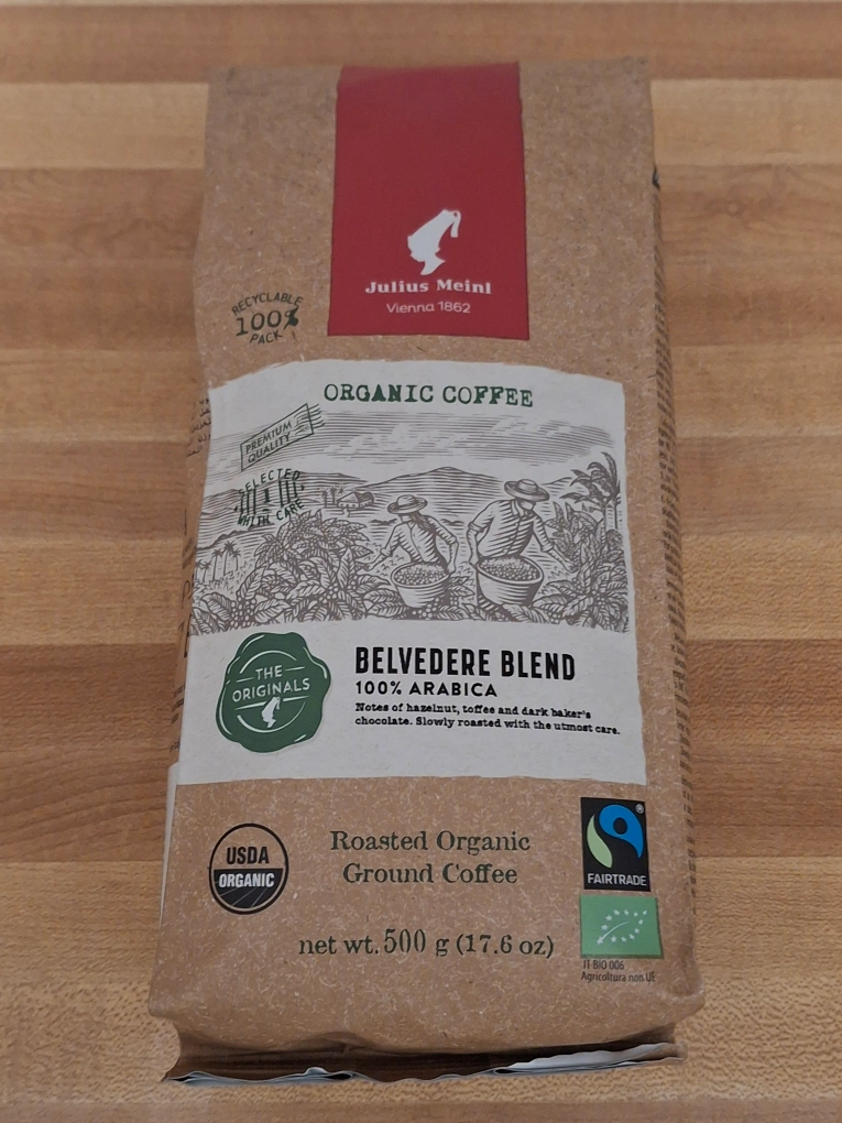 Selling a bag of Julius Meinl Belvedere Blend Organic Coffee. It's 100% Arabica, with notes of hazelnut, toffee, and dark baker's chocolate. This roasted organic ground coffee comes in a 500g (17.6 oz) pack. Recyclable pack too!