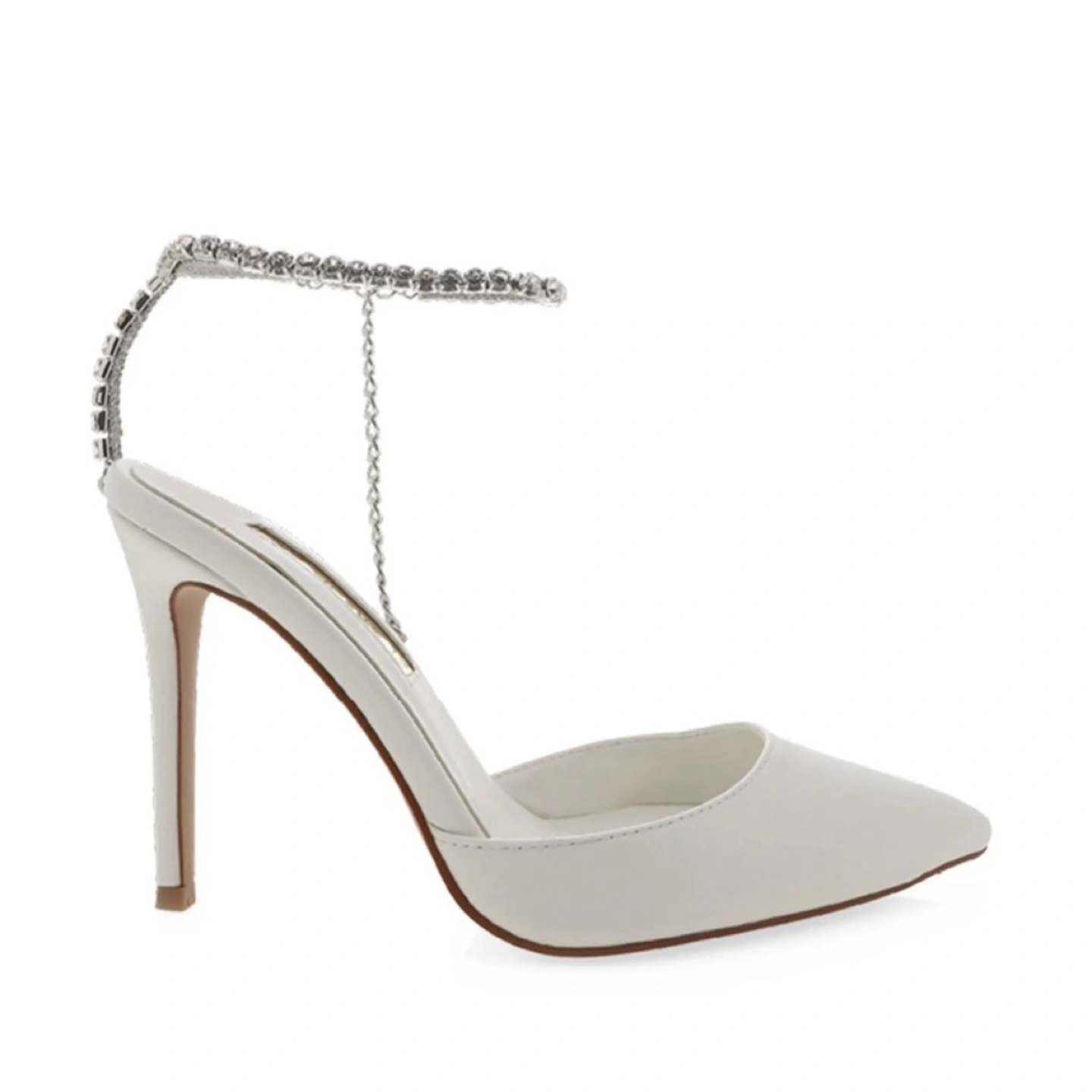 These white heels feature a delicate ankle strap with rhinestone detailing, adding a touch of sparkle. Perfect for a special occasion or a night out