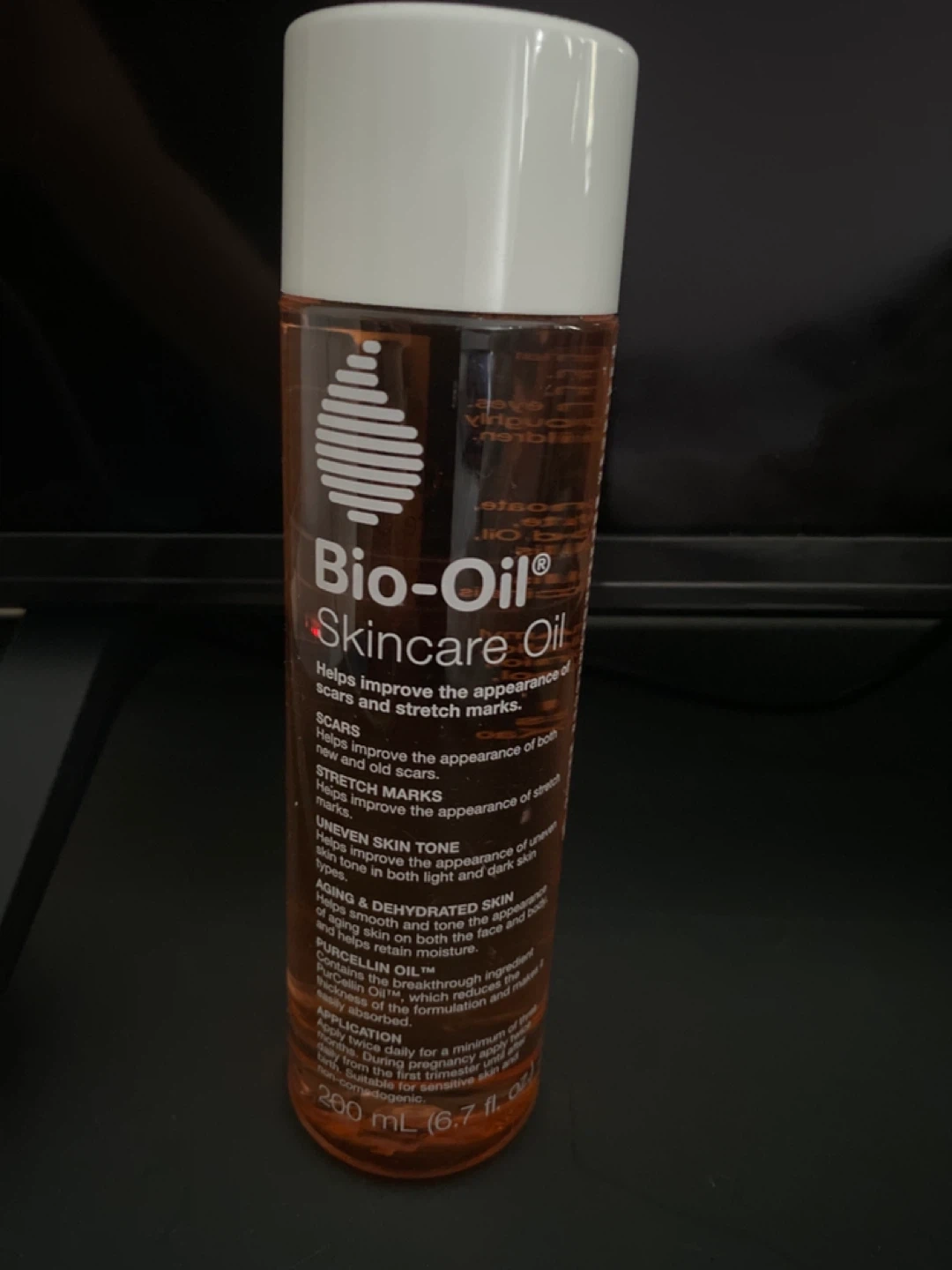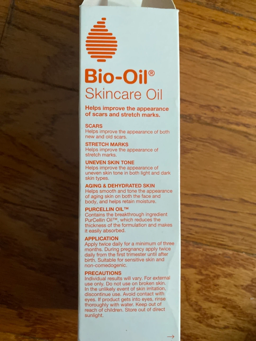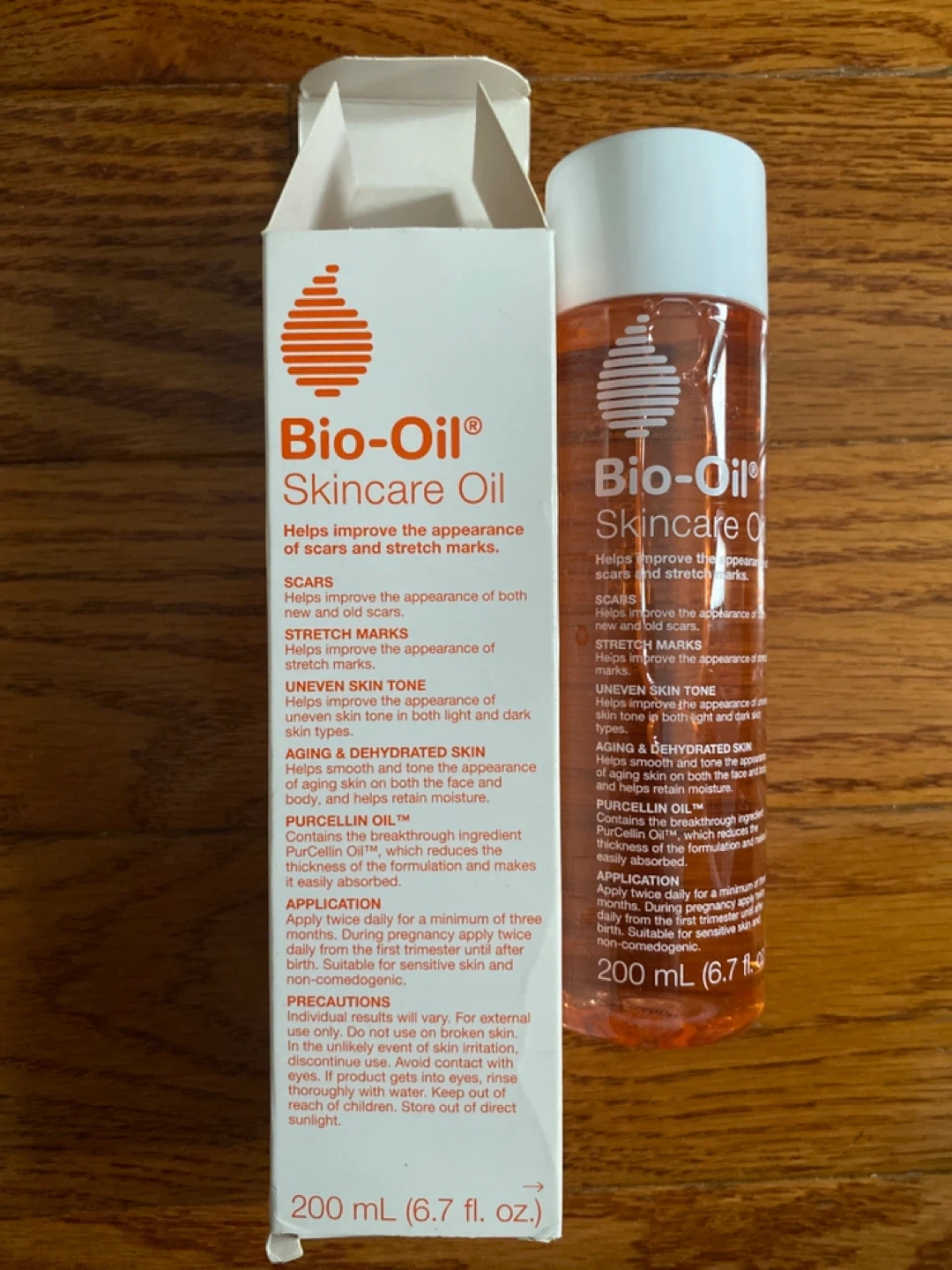Selling a bottle of Bio-Oil Skincare Oil, 6.7 fl oz. It helps improve the appearance of scars and stretch marks. It's also great for uneven skin tone and aging/dehydrated skin. The box contains information about Purcellin Oil, which reduces the thickness of the formulation and makes it easily absorbed