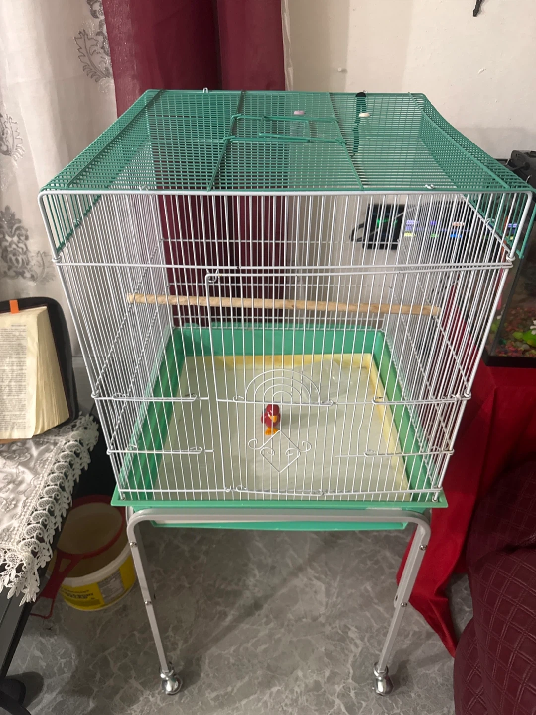 10Selling a bird cage with a green top and white bars. It includes a perch inside for your feathered friend! The cage also has a green base and a stand, making it easy to move around.