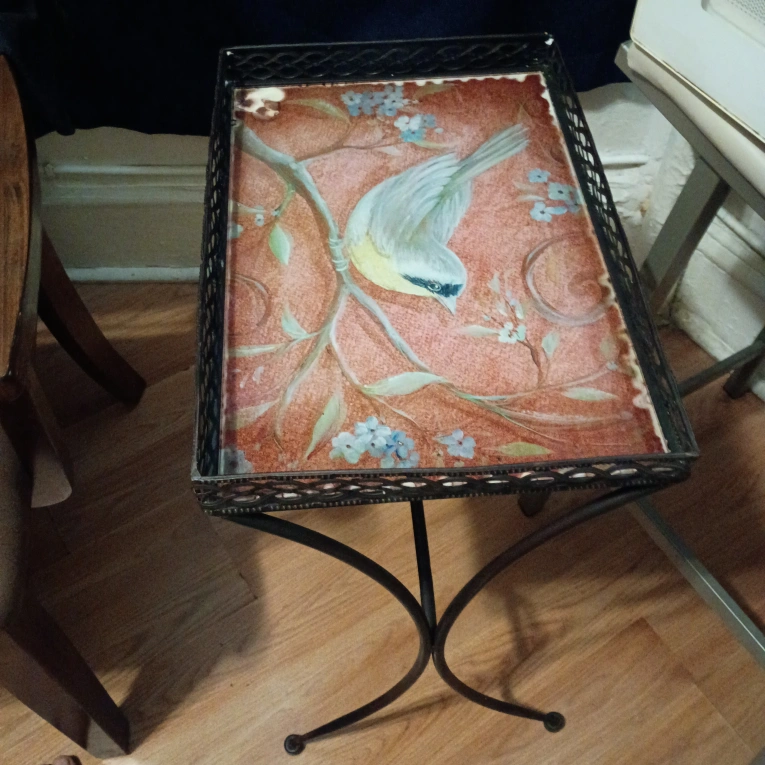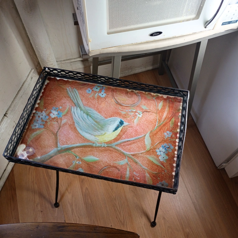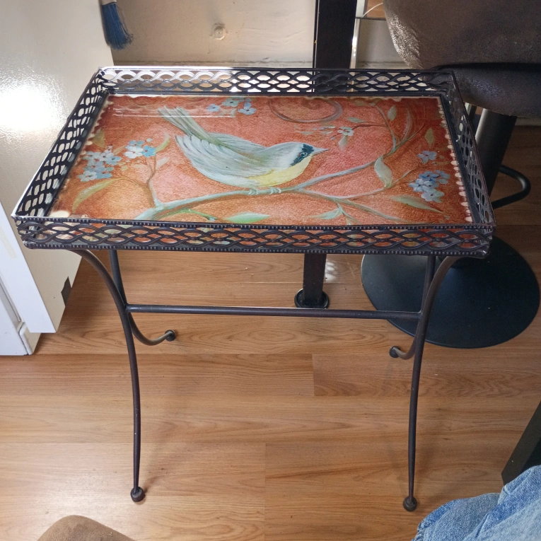 Here's a cute little tray table with a bird design! It has a metal frame and legs. Perfect for adding a touch of charm to any room 3478471080