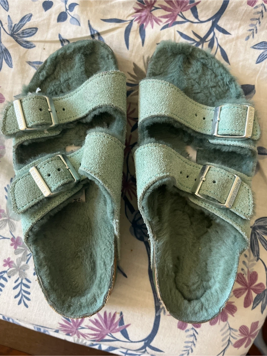 112Willing to lower the price. Just ask for it Selling a pair of Birkenstock Arizona Shearling sandals in size 36. They are a lovely green color and have a shearling lining for extra comfort. These sandals are perfect for a cozy and stylish look!