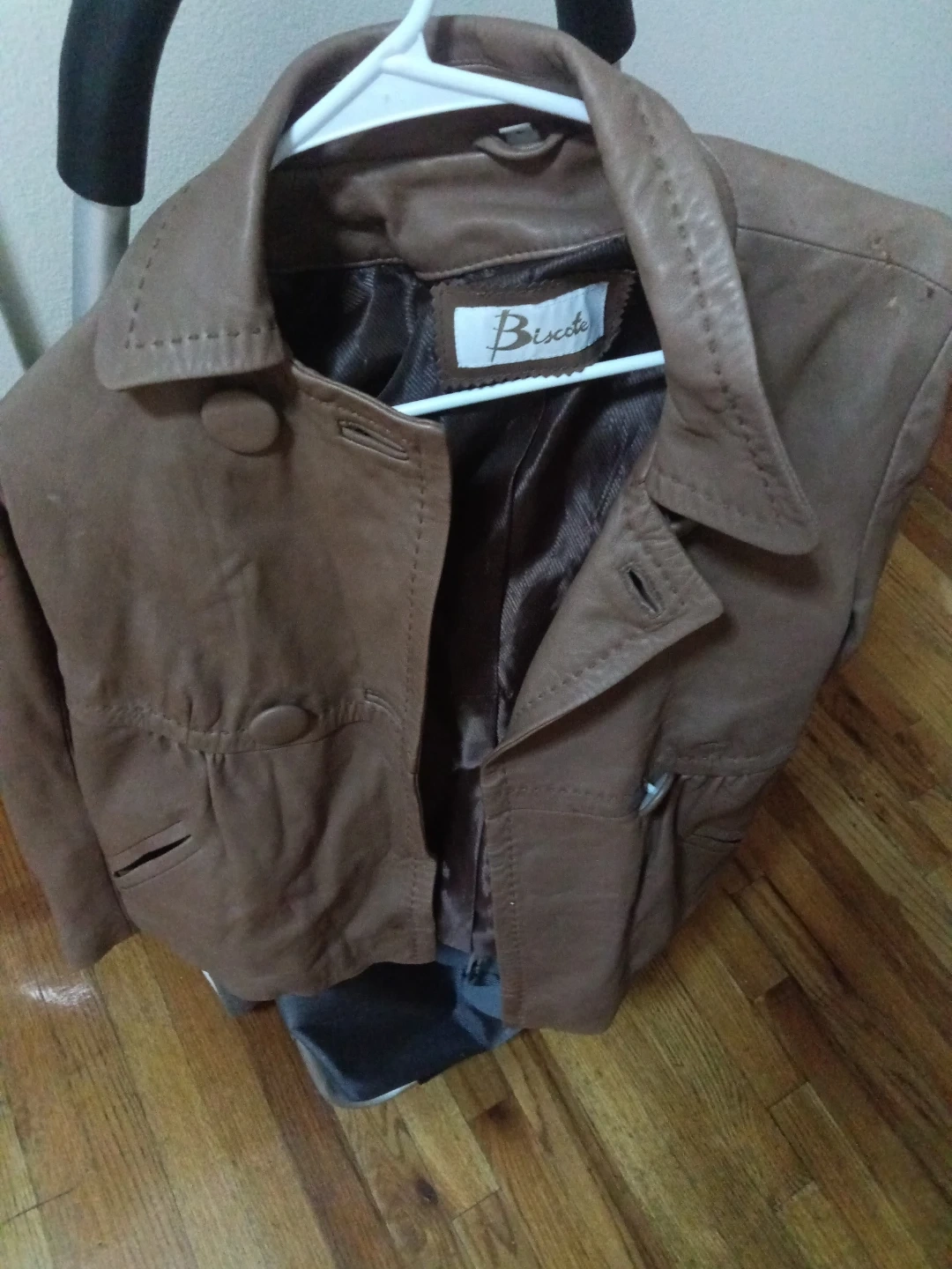 10Selling a Biscote brown leather jacket. It's in good condition and perfect for adding a touch of style to any outfit! The jacket features a classic design with a button-up front and a comfortable fit