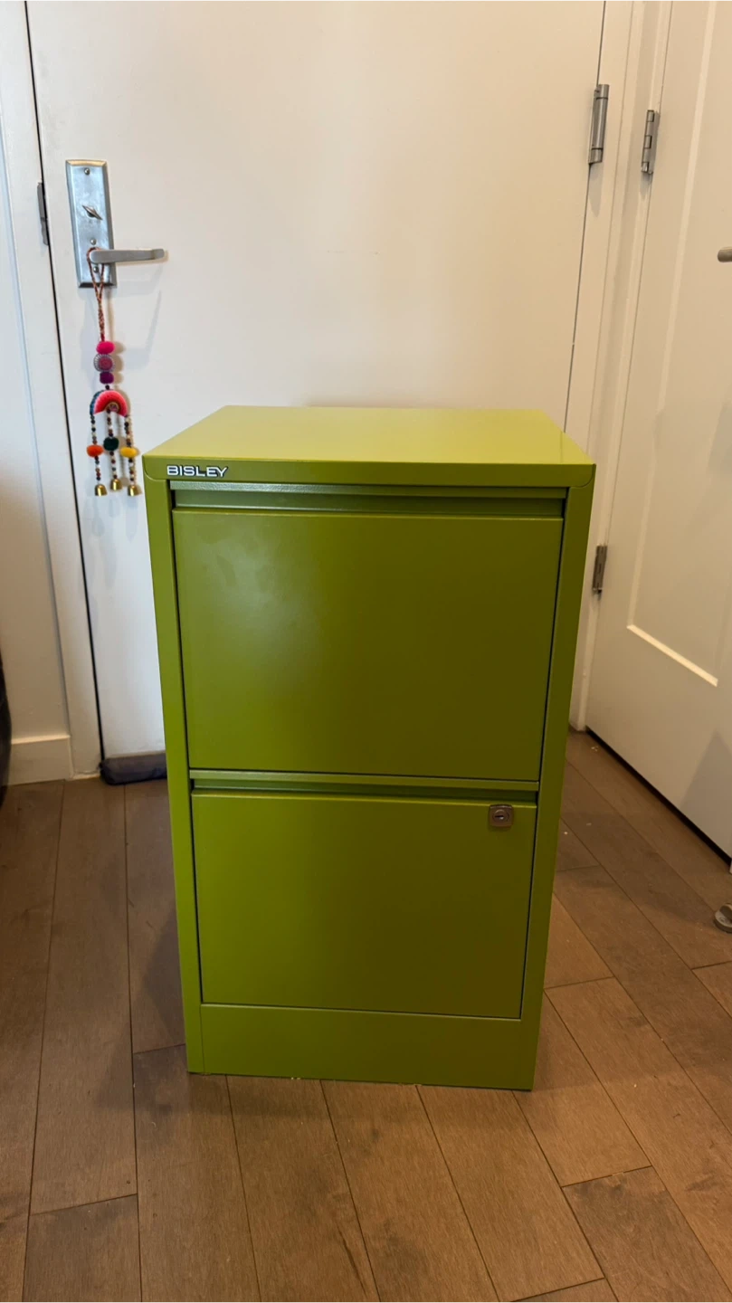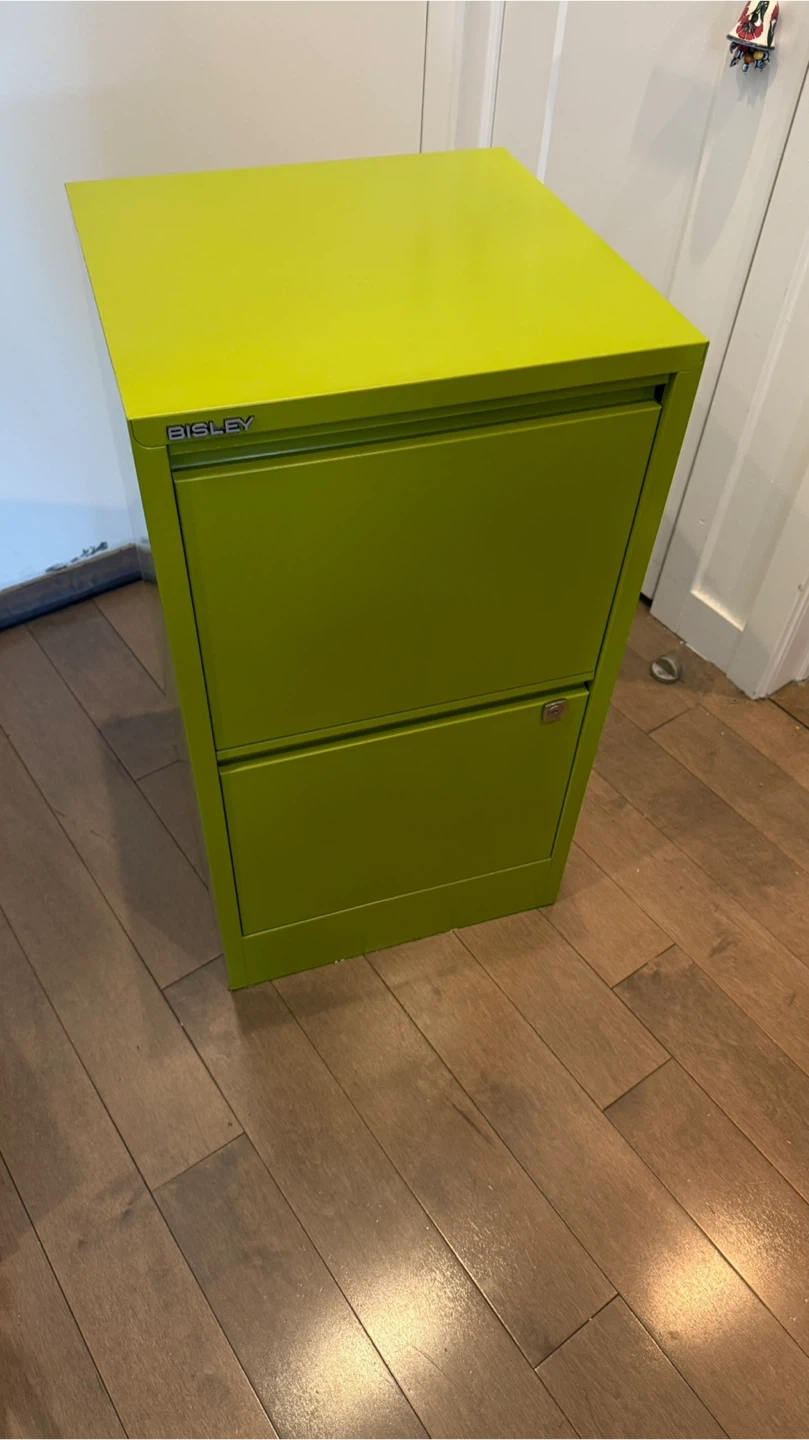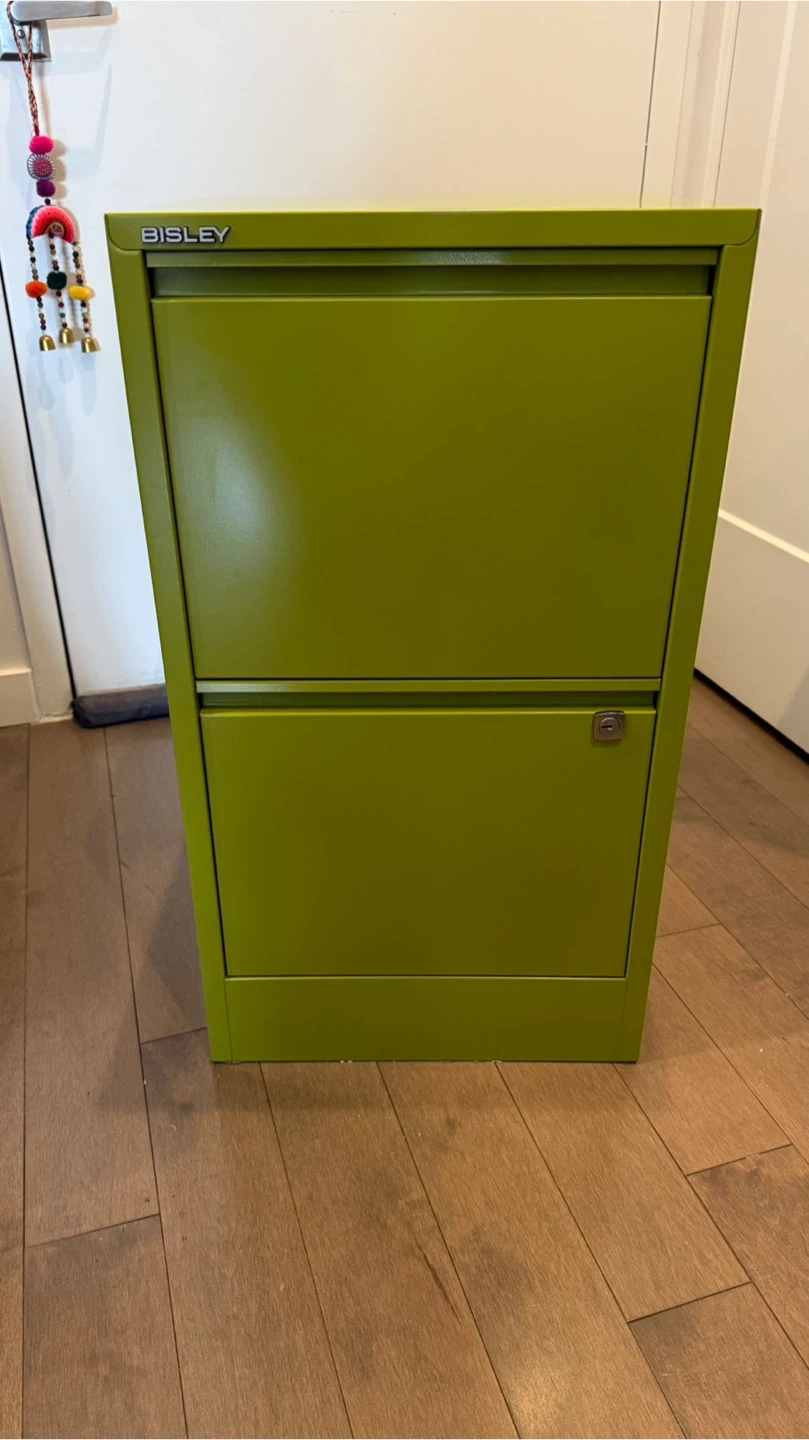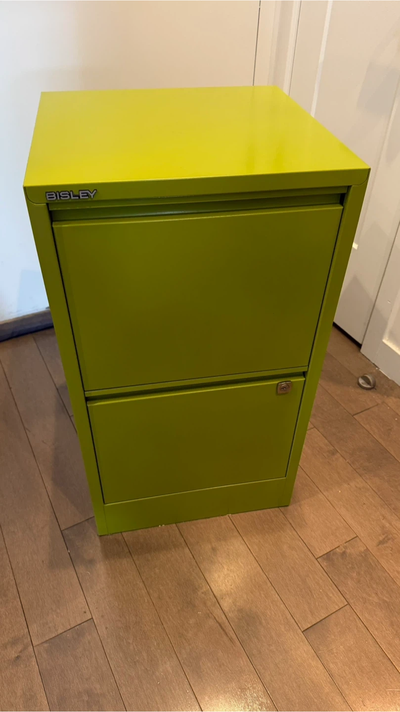 Selling a Bisley filing cabinet in a vibrant green color! It's a two-drawer cabinet, perfect for organizing your documents and files. It's in great condition and ready to bring some organization to your space