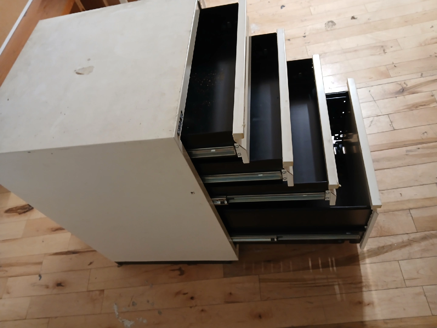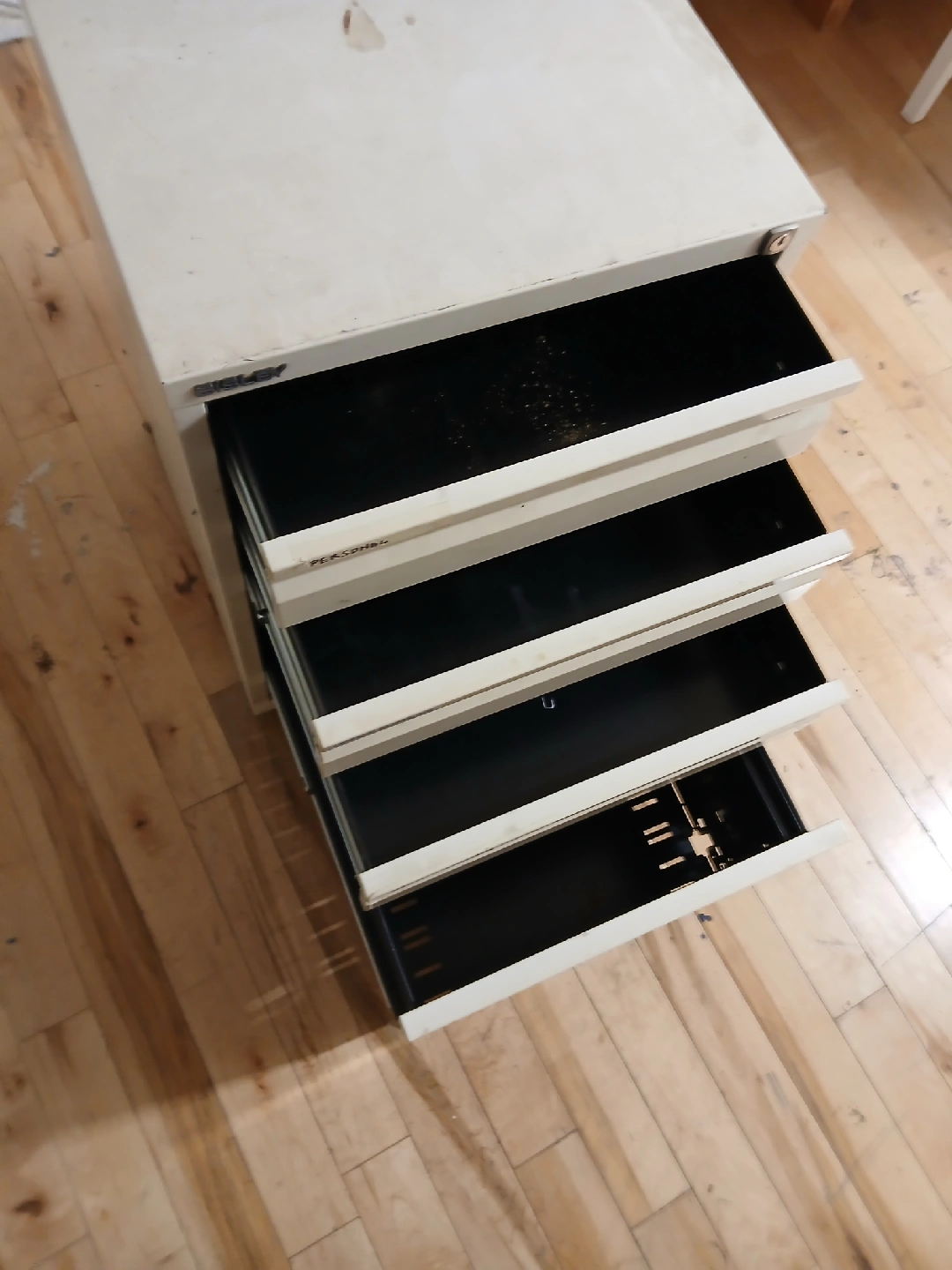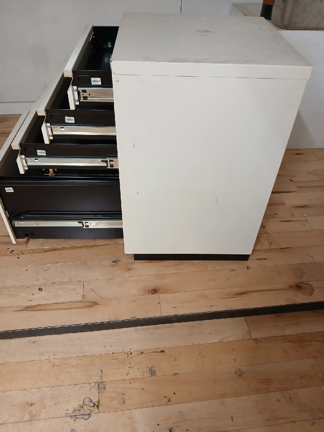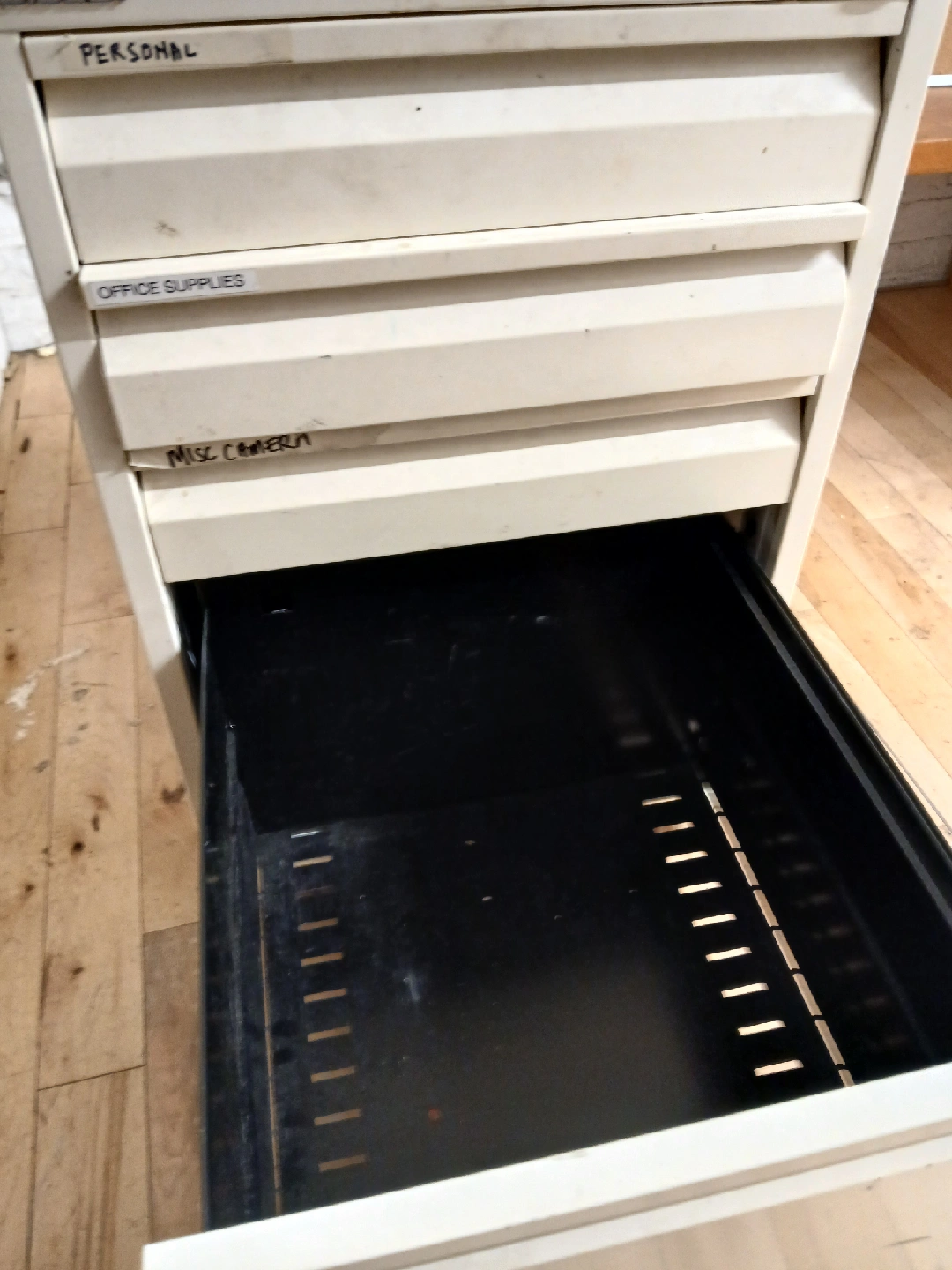 Selling a Bisley personal filing cabinet with three drawers. It's perfect for organizing your personal documents, office supplies, or even misc camera equipment. There are some signs of use, as shown in the pictures.