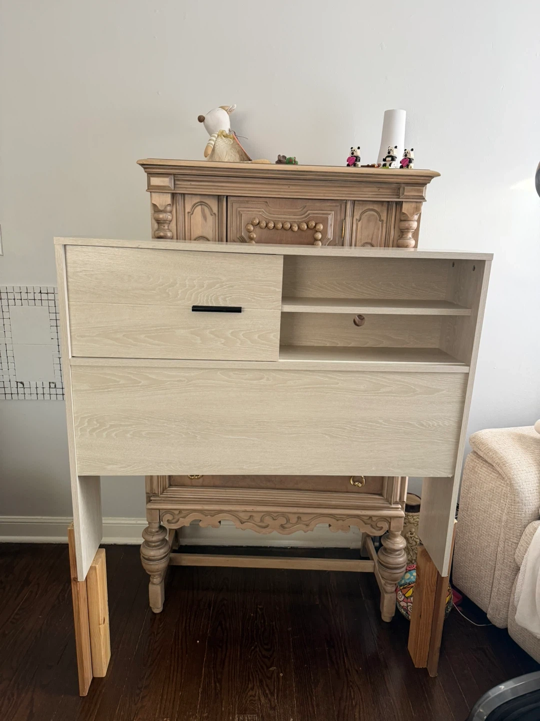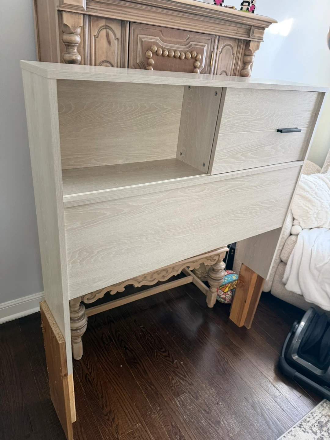 Light Wood Headboard with Storage Drawer and Shelves