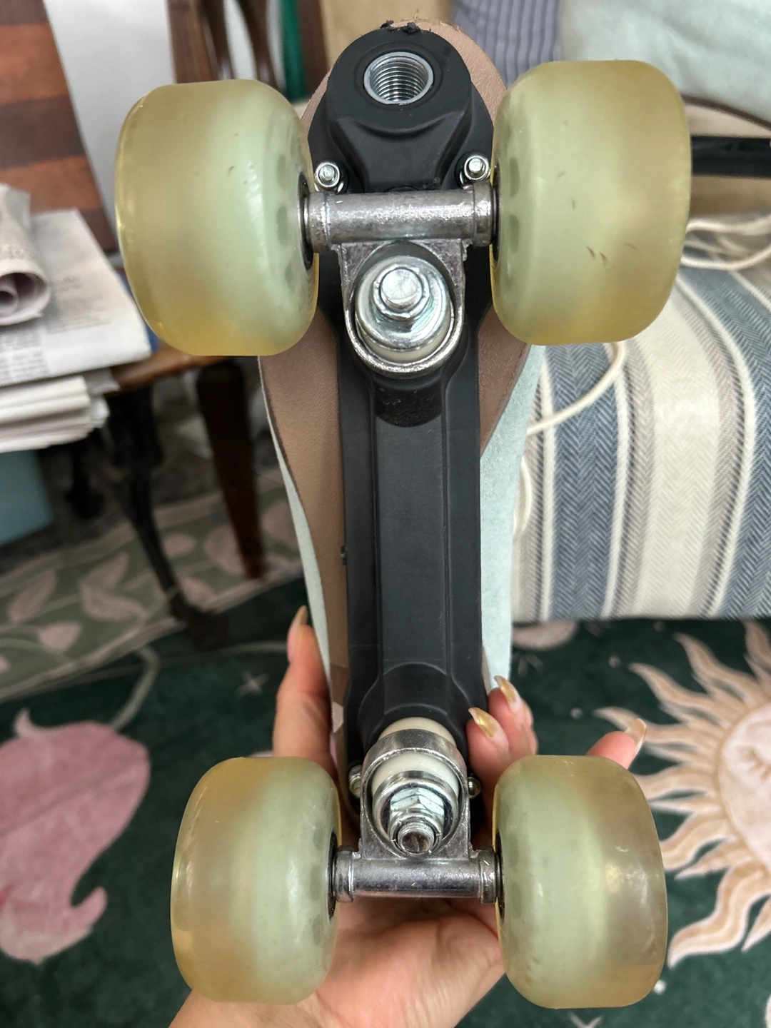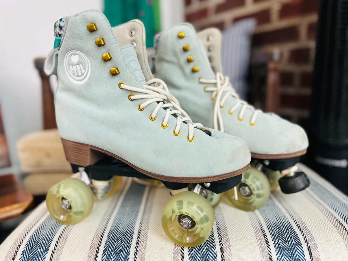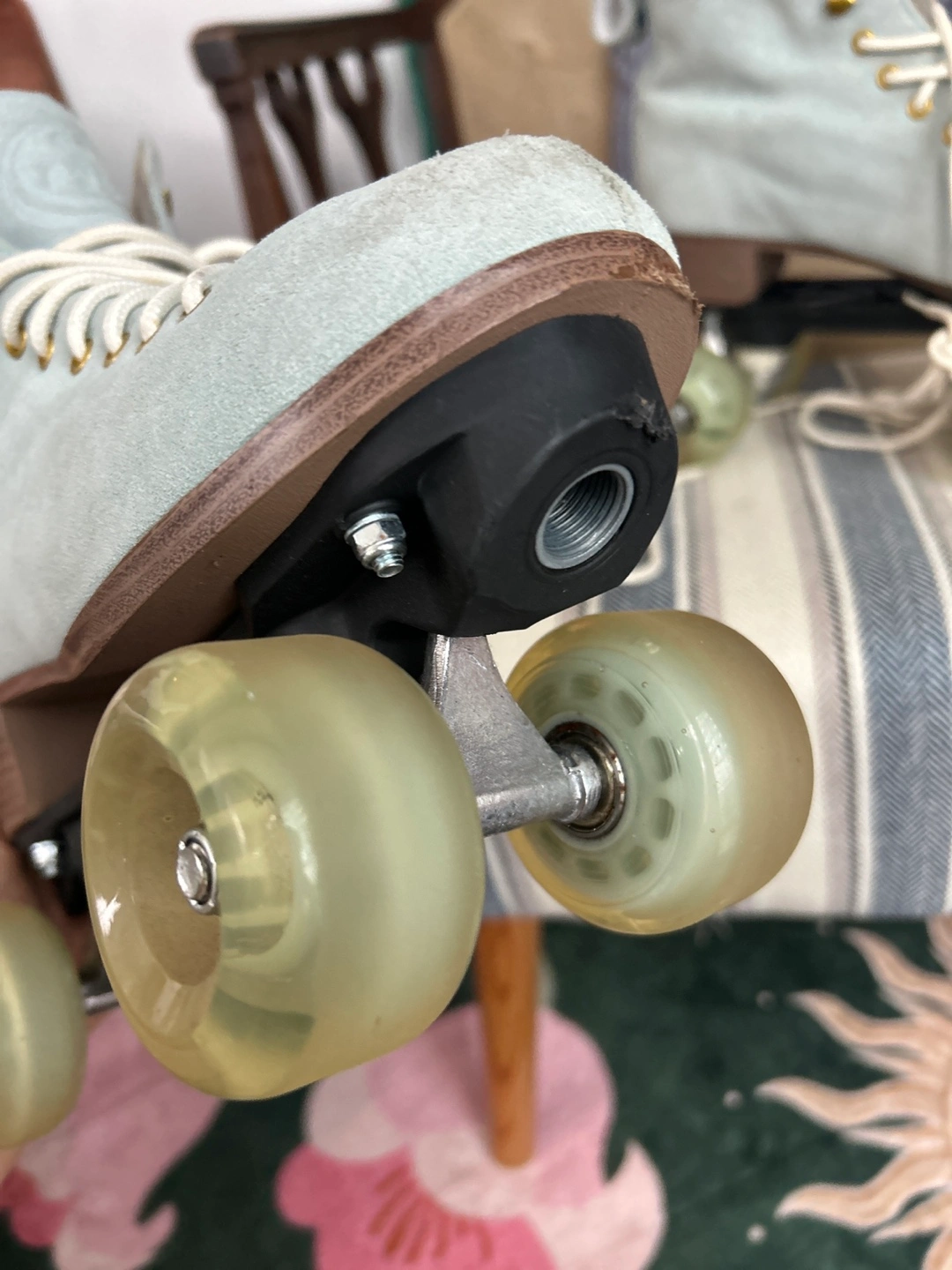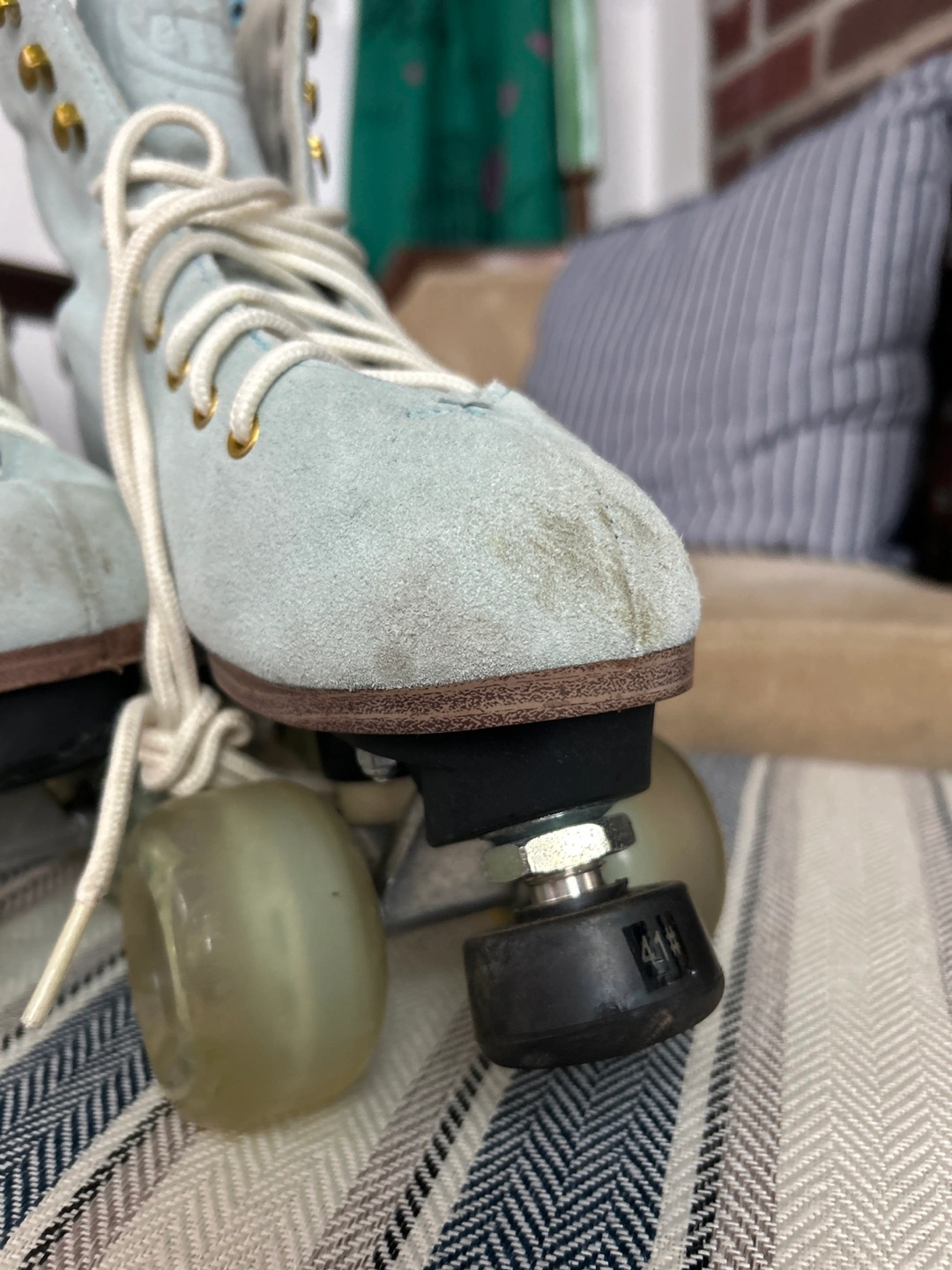 Selling a pair of Bitfil Scarlett Pro roller skates in US size 10. They have a light blue suede-like material and show some signs of wear, as pictured. Use maybe three times before my ankles would not entertain my endeavors- missing one of the stoppers. These are ready for some fun at the rink or on the street!
