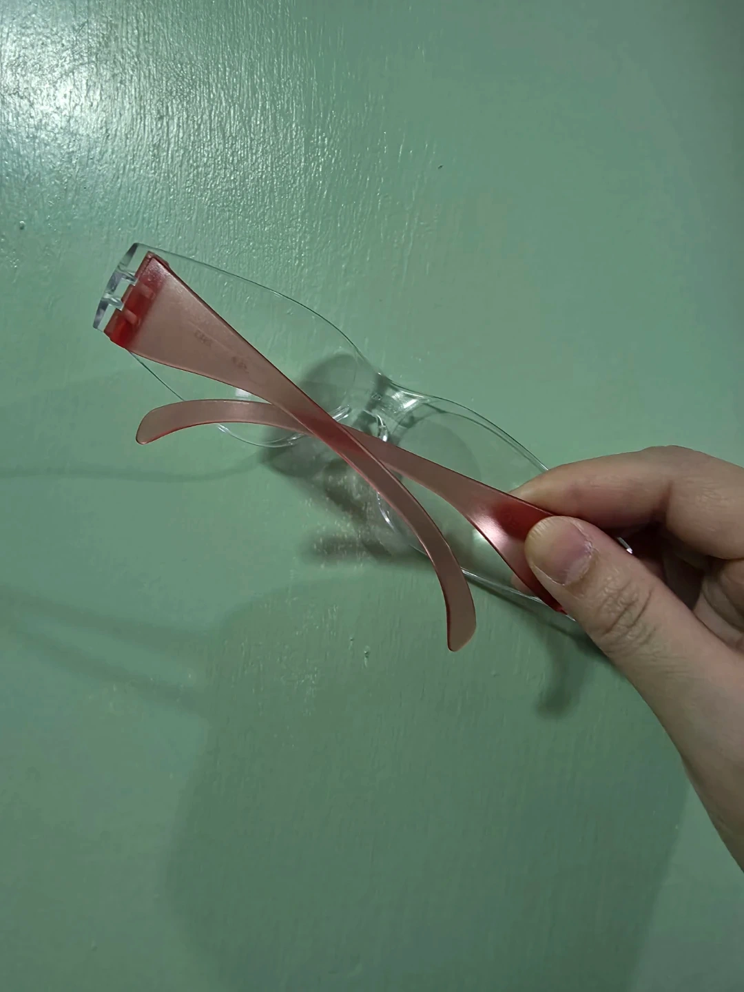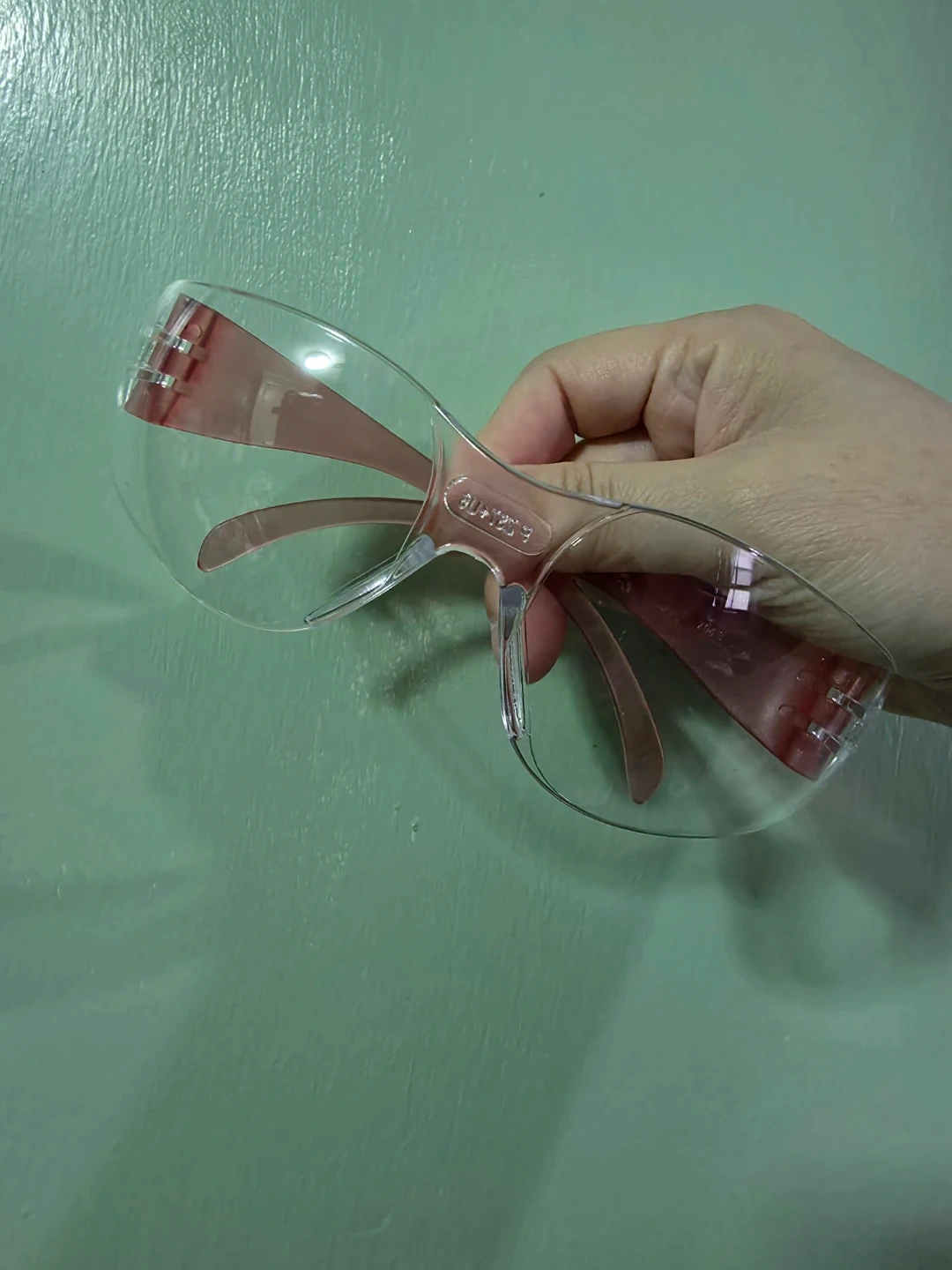 Received from Olaplex pop-up so their name is on it. Clear protective eyewear. These glasses feature a wrap-around design for a secure fit. They're made of durable, clear plastic with pink accents on the arms. One size fits most. I have 3 of them if you're interested.