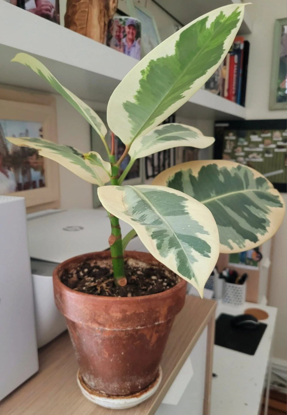 Beautiful variegated rubber tree plant. It's in a terracotta pot with soil. The plant has large, striking leaves with green and cream coloring. Perfect for adding a touch of green to your home!
