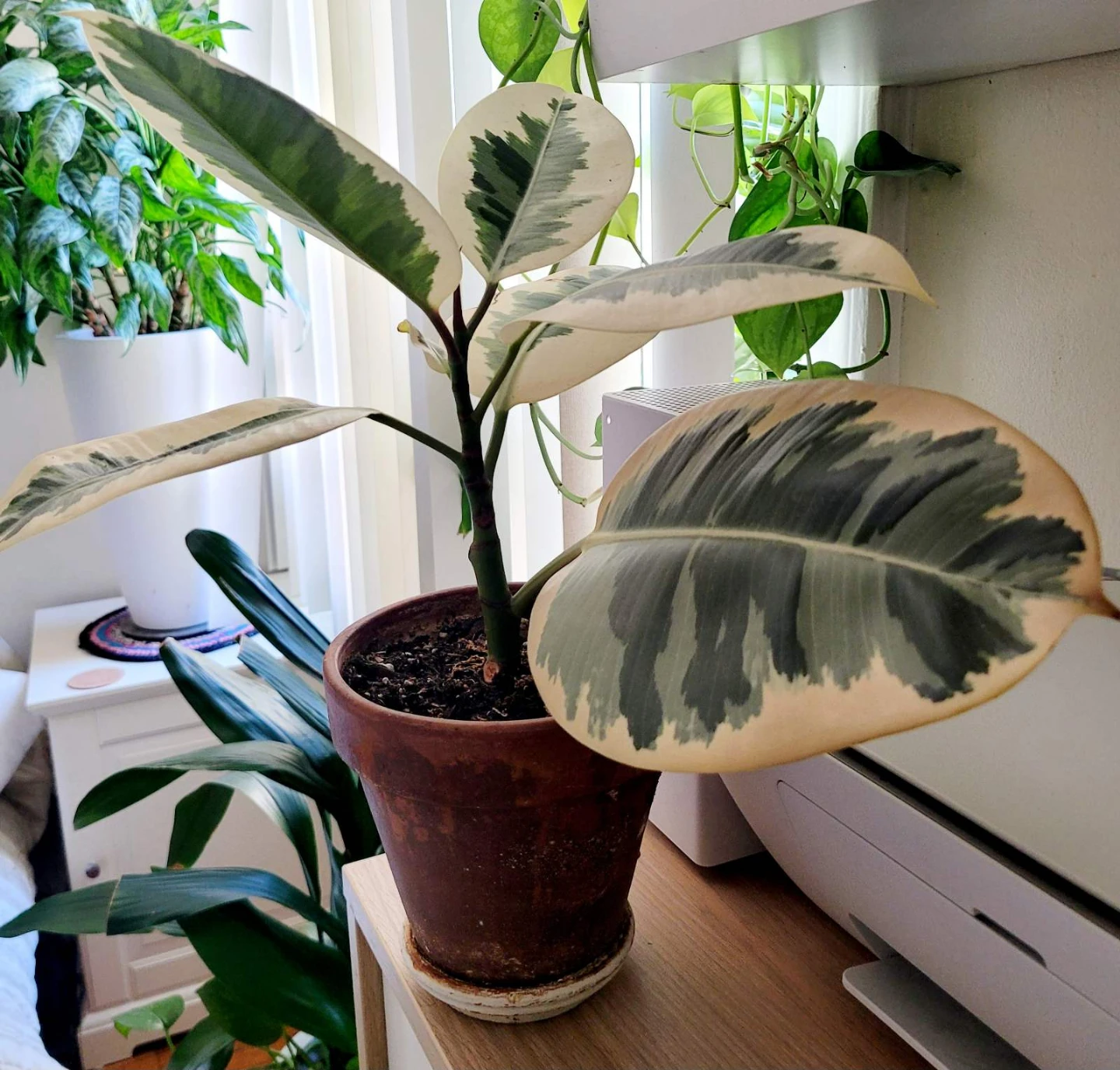 Beautiful variegated rubber tree plant. It's in a terracotta pot with soil. The plant has large, striking leaves with green and cream coloring. Perfect for adding a touch of green to your home!