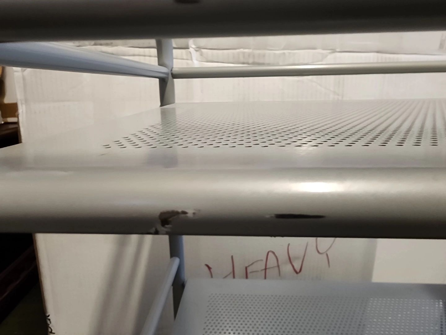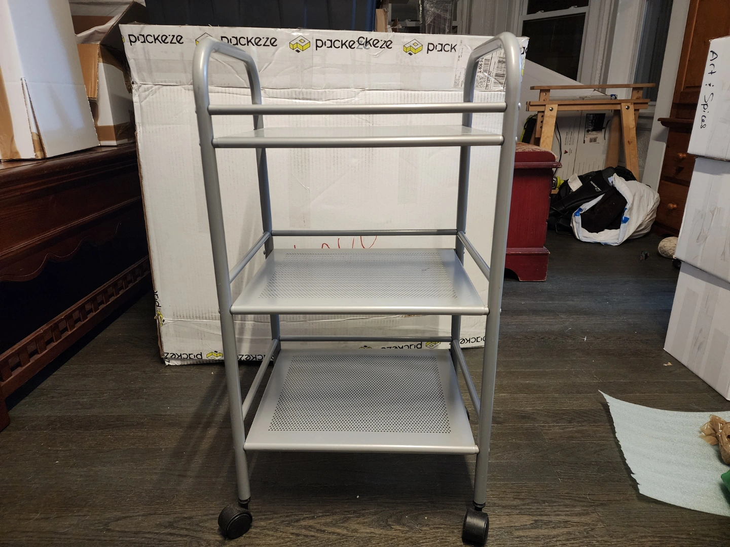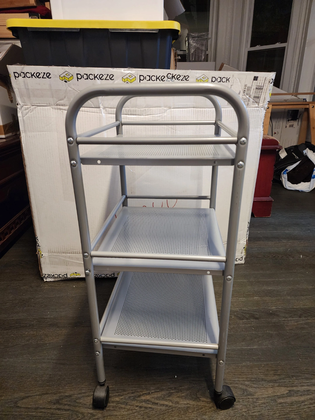Three-tiered metal cart with perforated metal shelves and wheels. Light gray finish with some minor scratches. Originally purchased from Ikea as additional bathroom storage, works great as a towel cart.