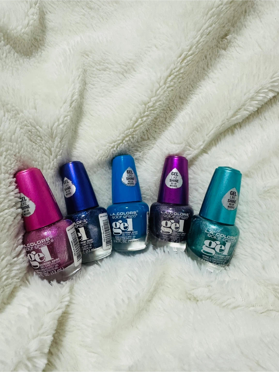 Five bottles of L.A. Colors Gel-Like nail polish. Each bottle contains 0.44 fl. oz. (13 mL). Offers extreme shine with no UV lamp needed! These polishes come in various sparkling shades.