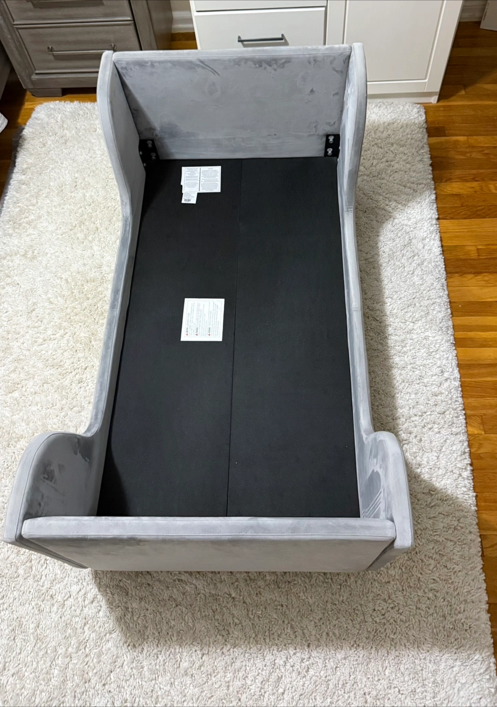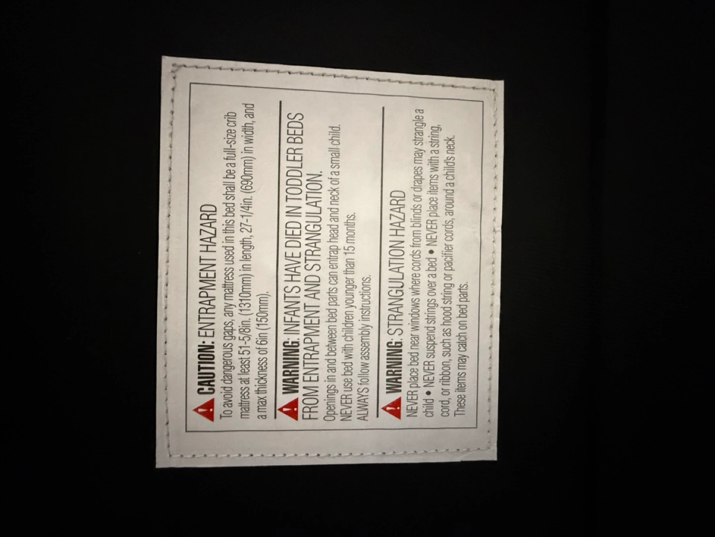 This is a full-size crib that can be used in a toddler bed frame. It's designed to accommodate a mattress at least 51-5/8 inches (1310mm) in length and 27-1/4 inches (690mm) in width, with a maximum thickness of 6 inches (150mm).