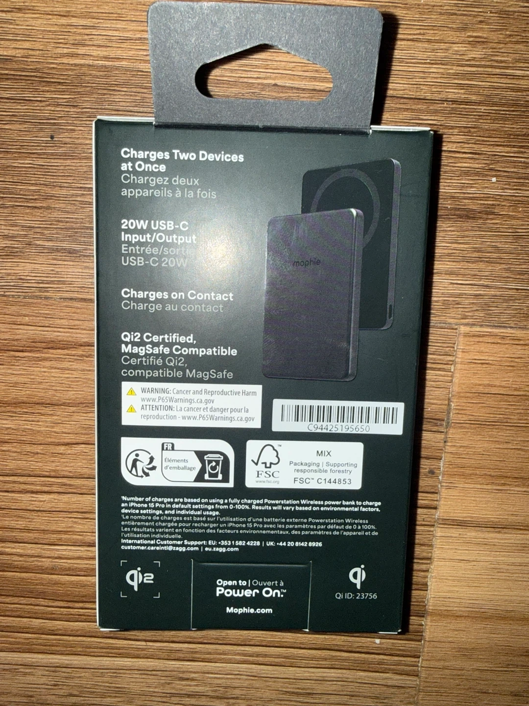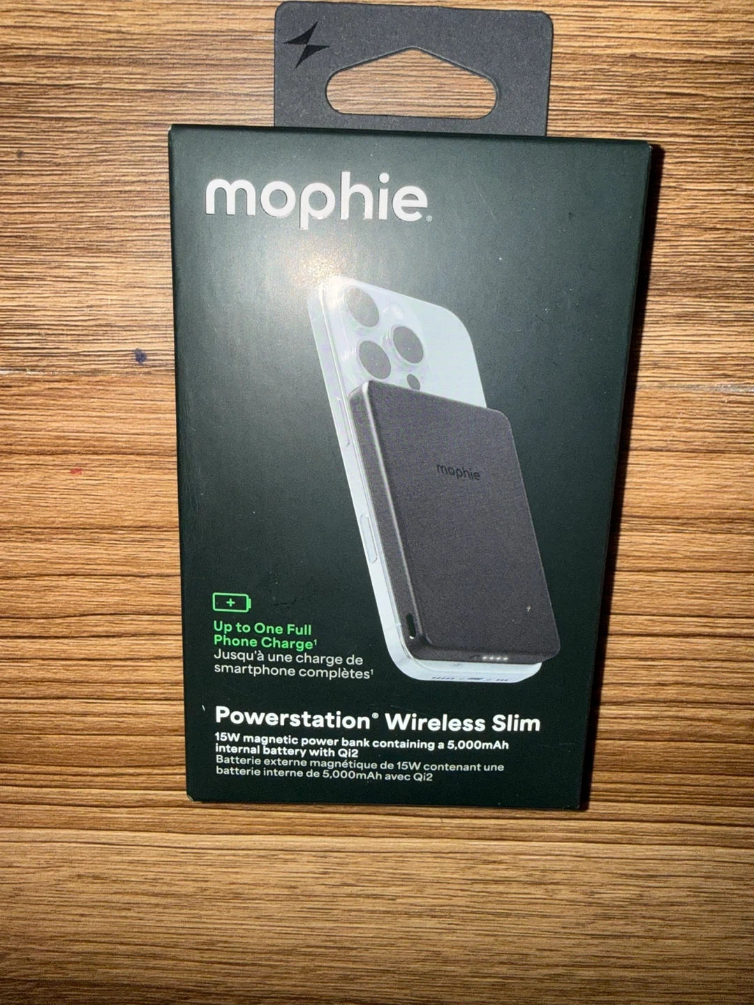 Mophie Powerstation Wireless Slim magnetic power bank. It's a 5000mAh portable charger with 15W wireless charging. Supports Qi2 charging and USB-C input/output.