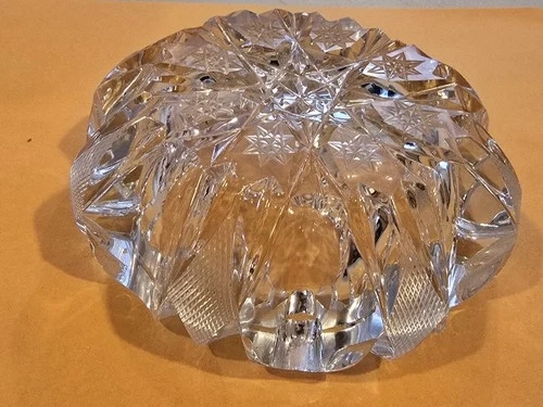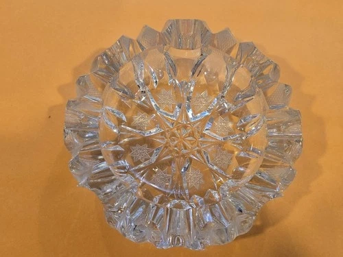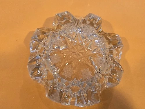 This Mid Century Modern Lead Crystal Ashtray has a 6" diameter, perfect for holding cigars or cigarettes while adding a touch of elegance to any space. Made in the United States, this collectible piece showcases the sleek and stylish design of the mid-century era. Its geometric patterns and lead crystal construction make it a unique and practical addition to any collection of tobacciana or decorative items.
