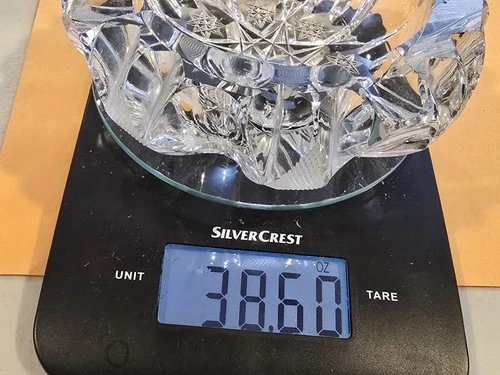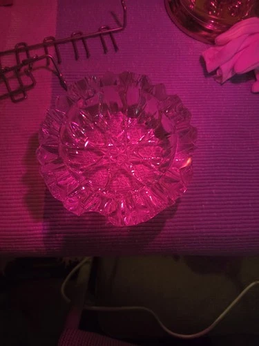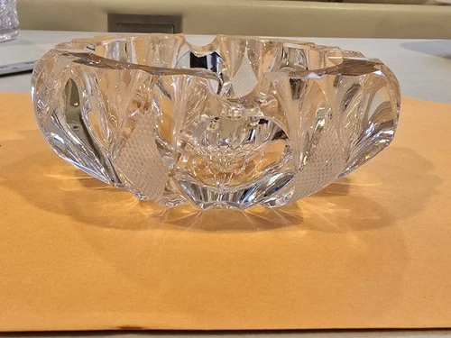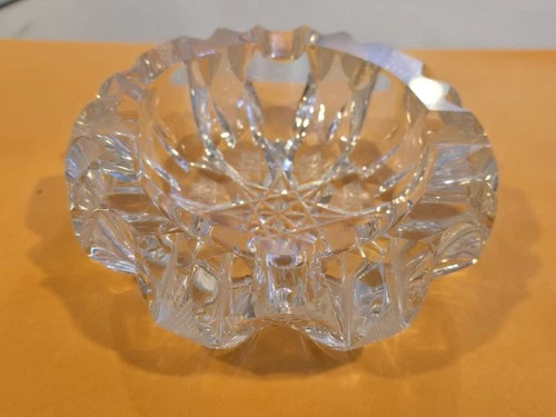 This Mid Century Modern Lead Crystal Ashtray has a 6" diameter, perfect for holding cigars or cigarettes while adding a touch of elegance to any space. Made in the United States, this collectible piece showcases the sleek and stylish design of the mid-century era. Its geometric patterns and lead crystal construction make it a unique and practical addition to any collection of tobacciana or decorative items.