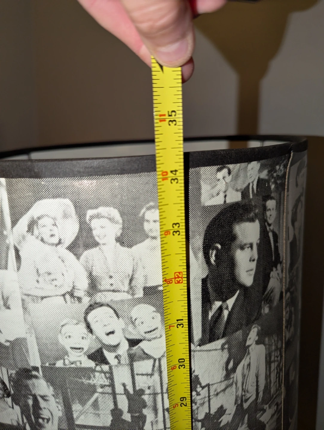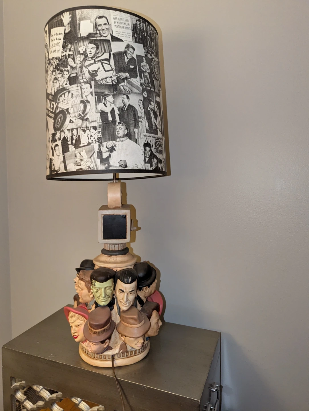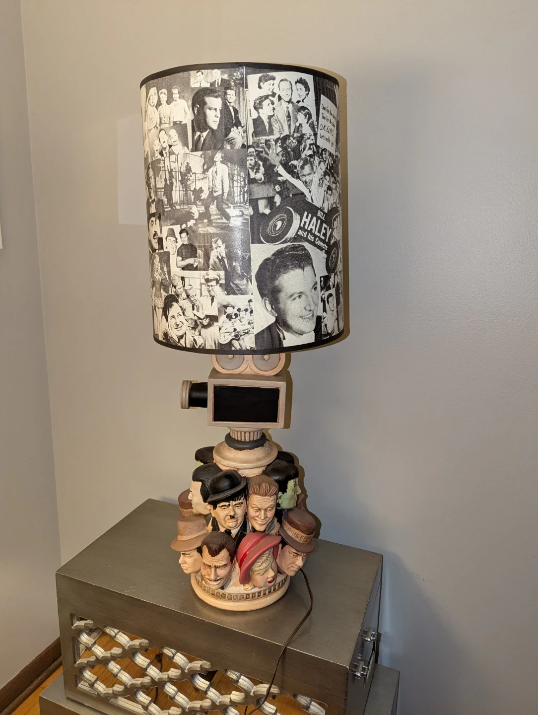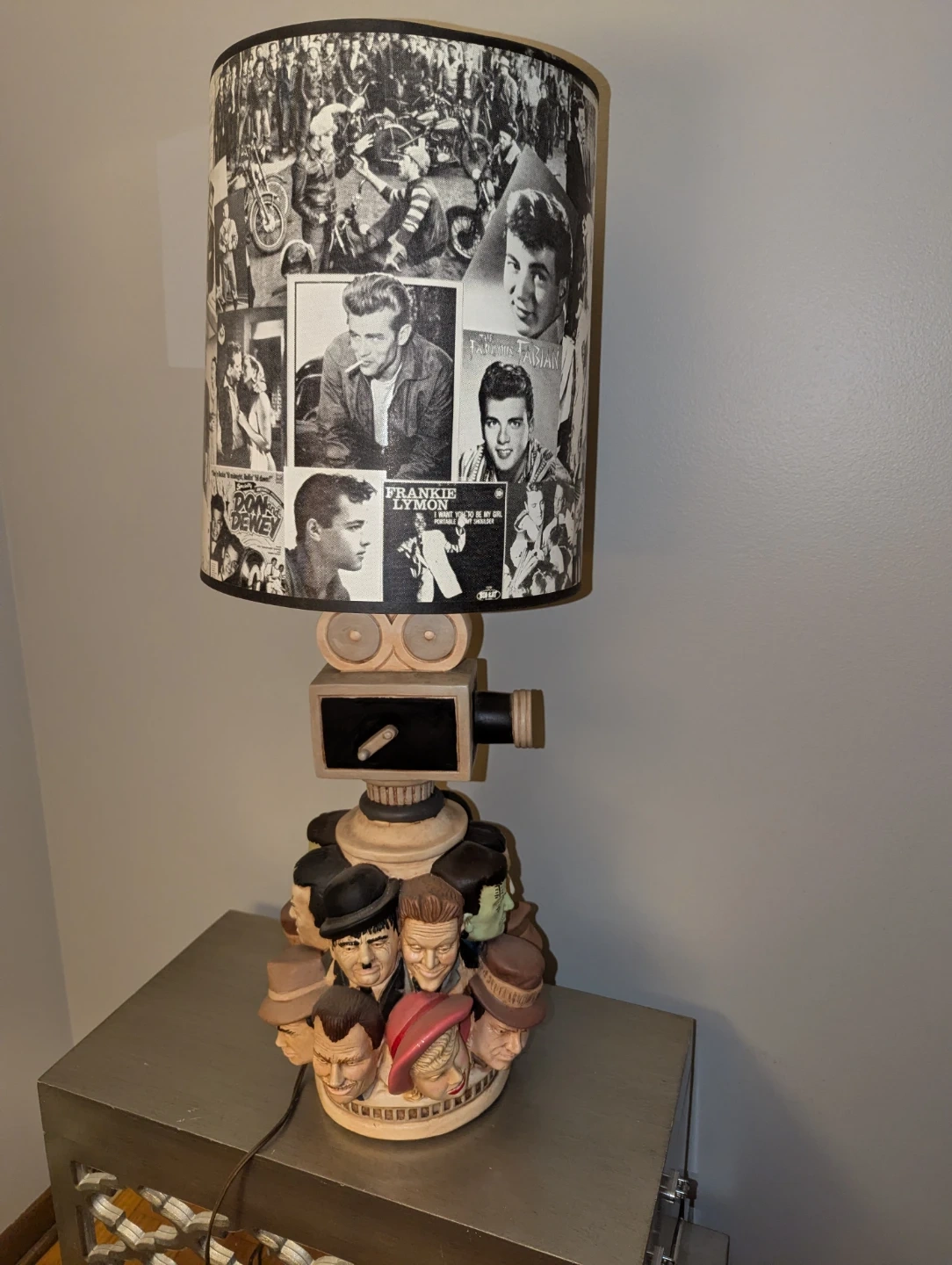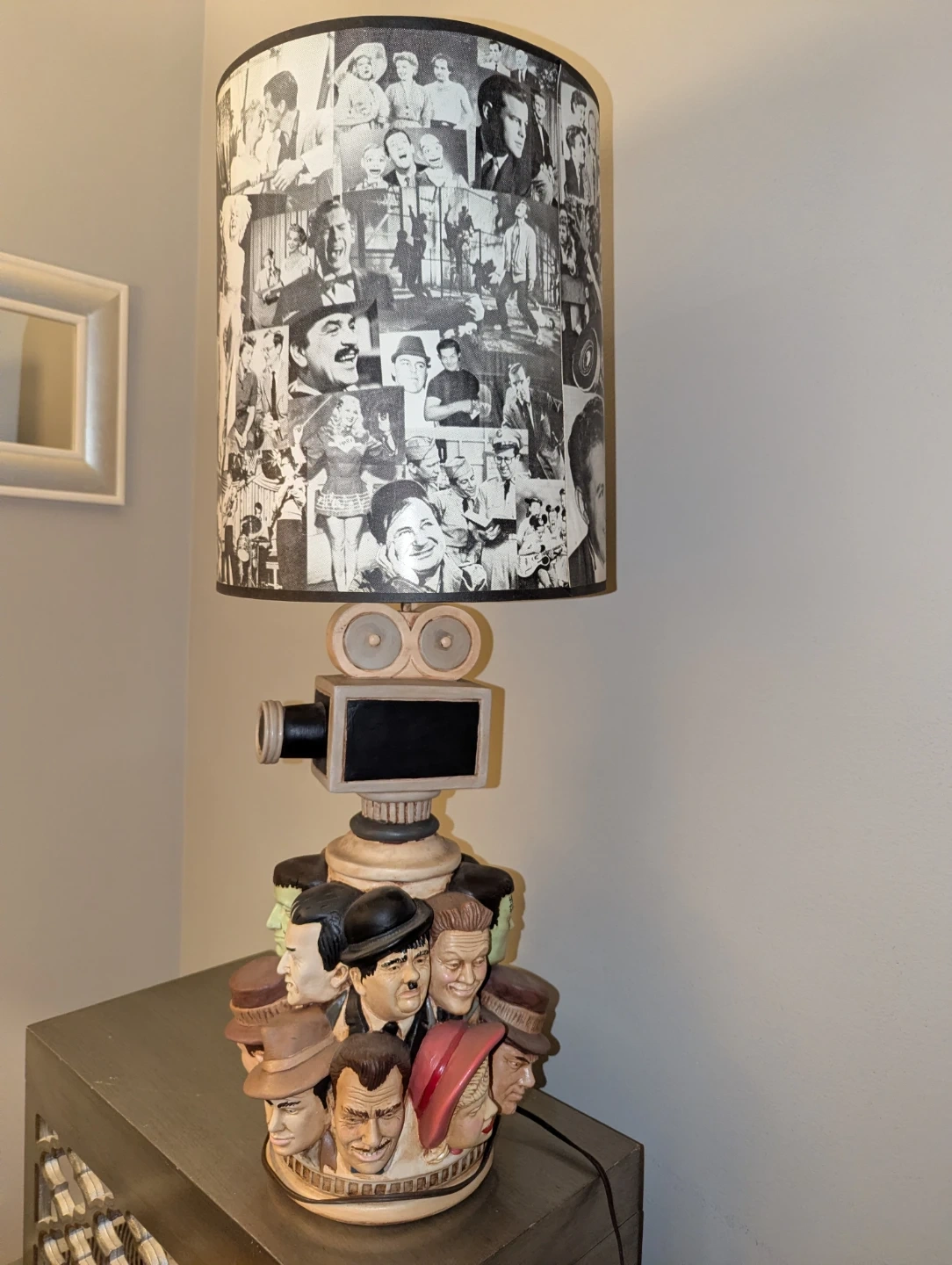 Here's a unique vintage lamp that's sure to be a conversation starter! The lamp features a base adorned with Hollywood characters and a lampshade covered in black and white images of classic stars and scenes. It would be a fantastic addition to any movie lover's home or a fun accent piece for a themed room.