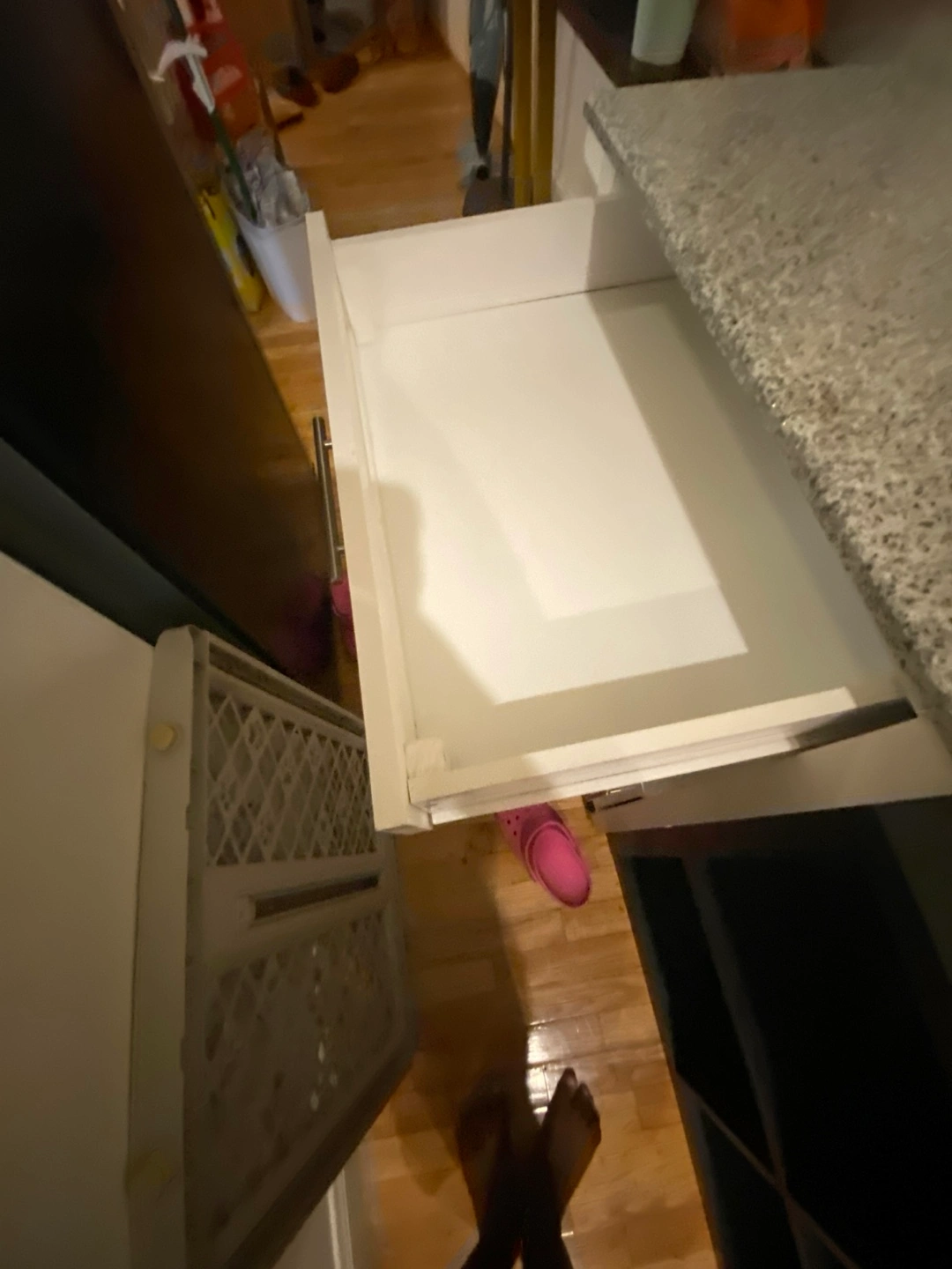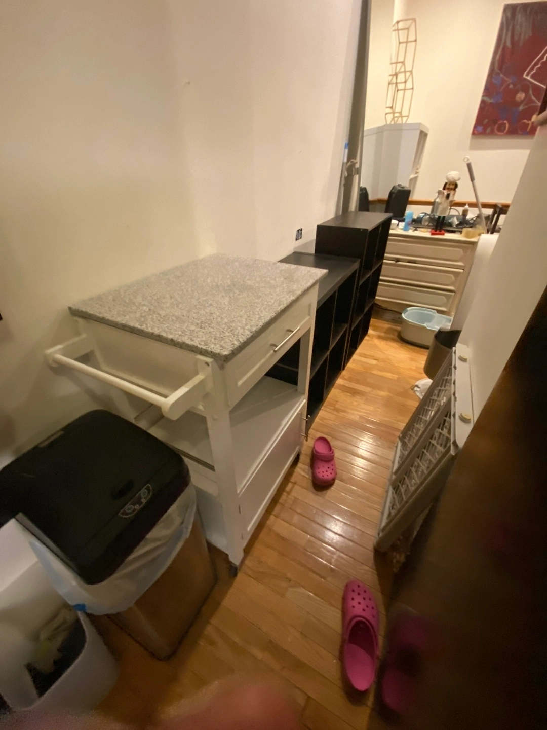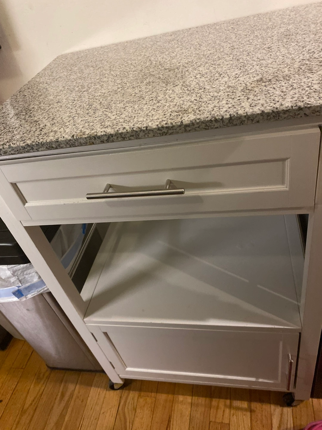 Selling a white kitchen island cart with a granite-style top. It features a drawer, open shelf, and a cabinet for storage. Great for adding extra counter space and storage to your kitchen