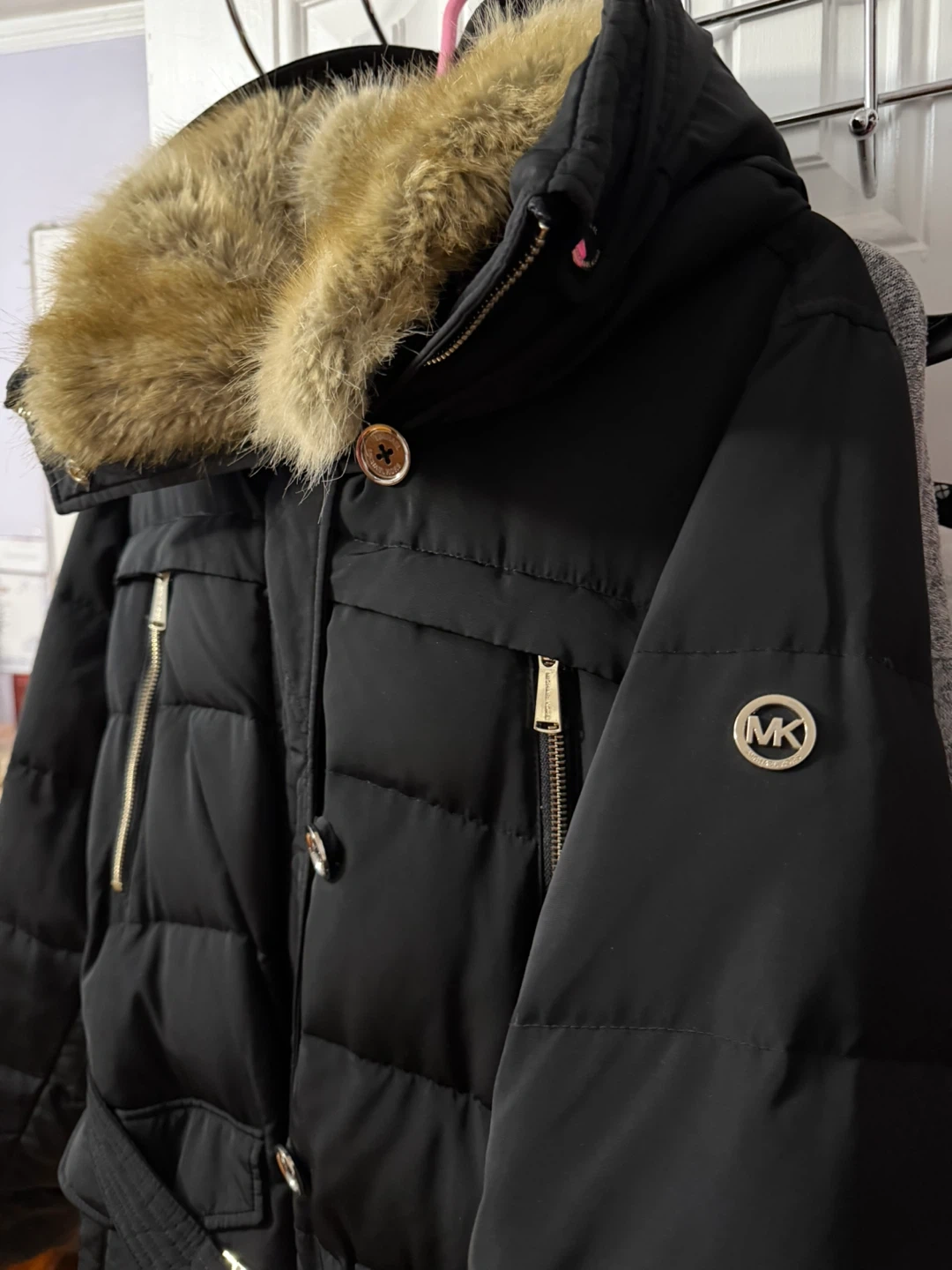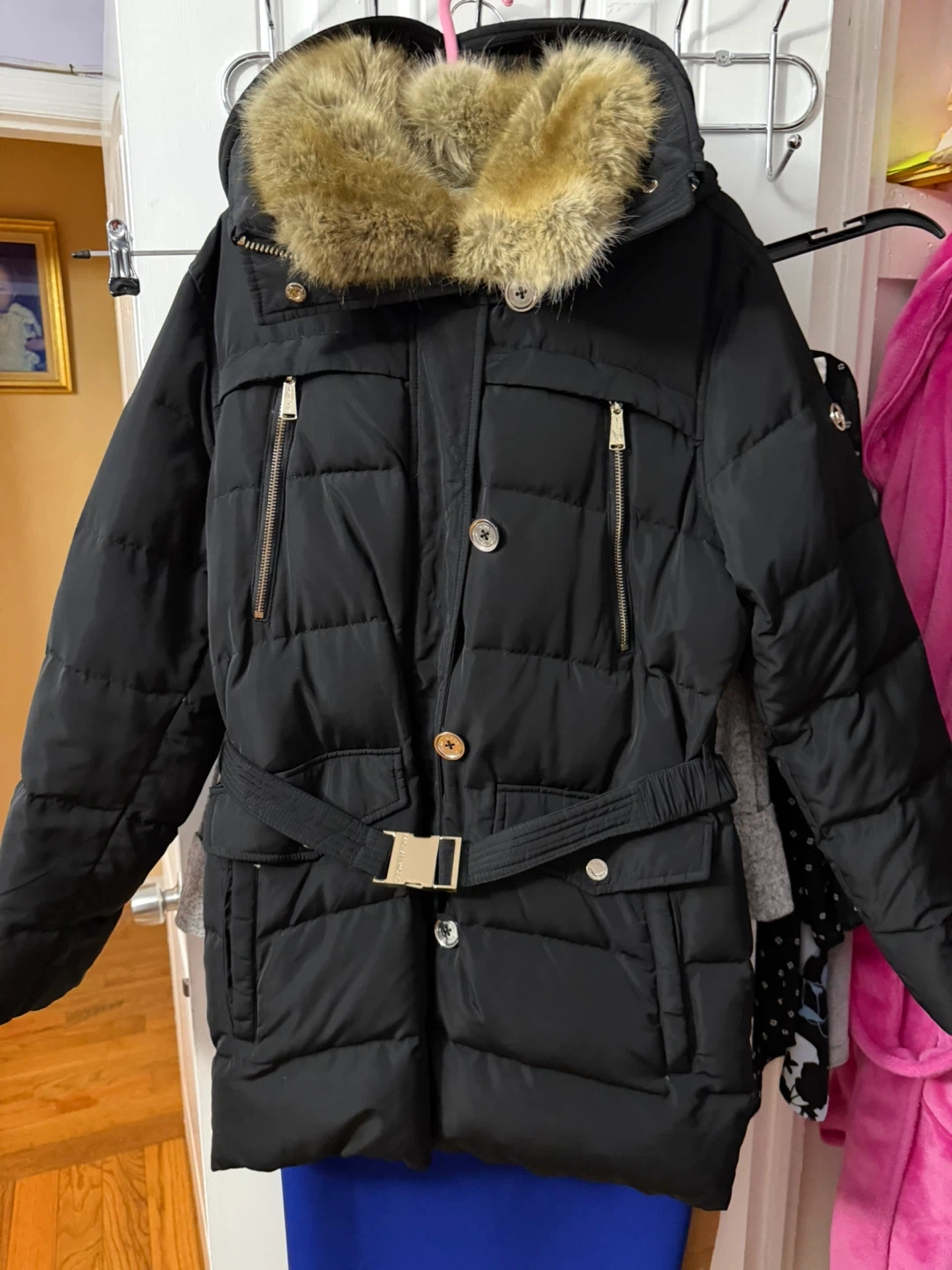 Black puffer parka with gold-tone hardware and a detachable fur-lined hood. It's a stylish and warm winter coat. Features a belted waist and multiple pockets.