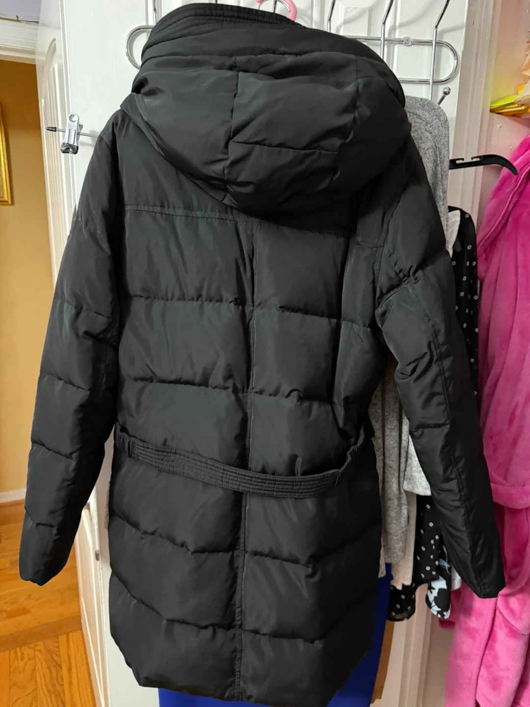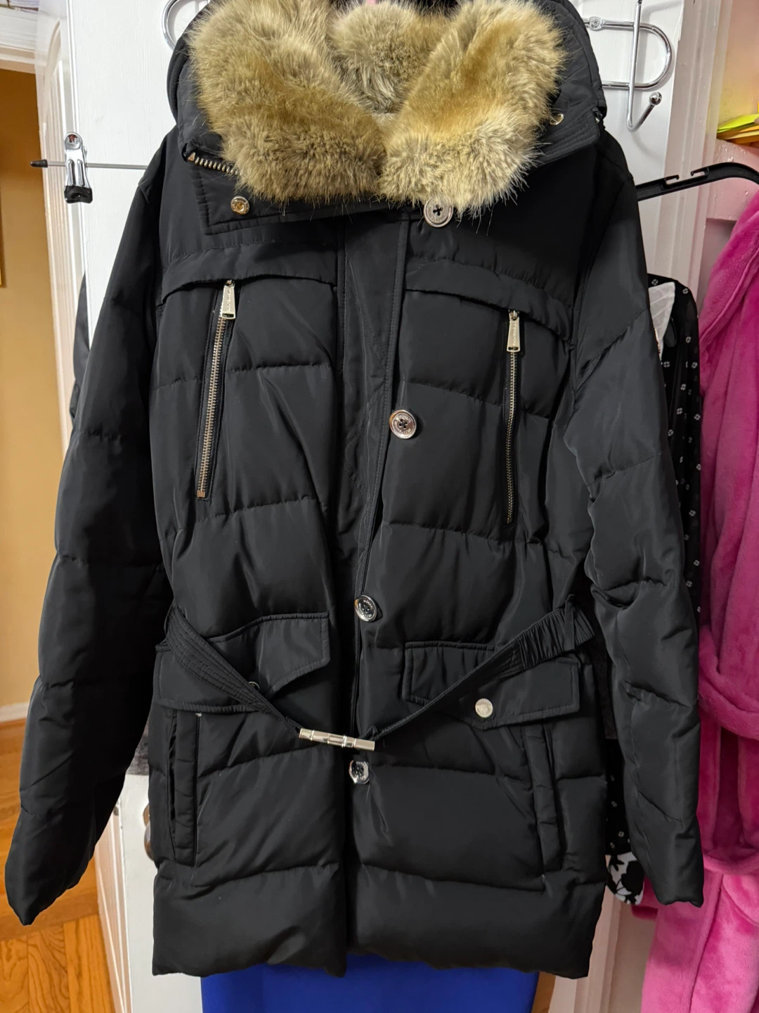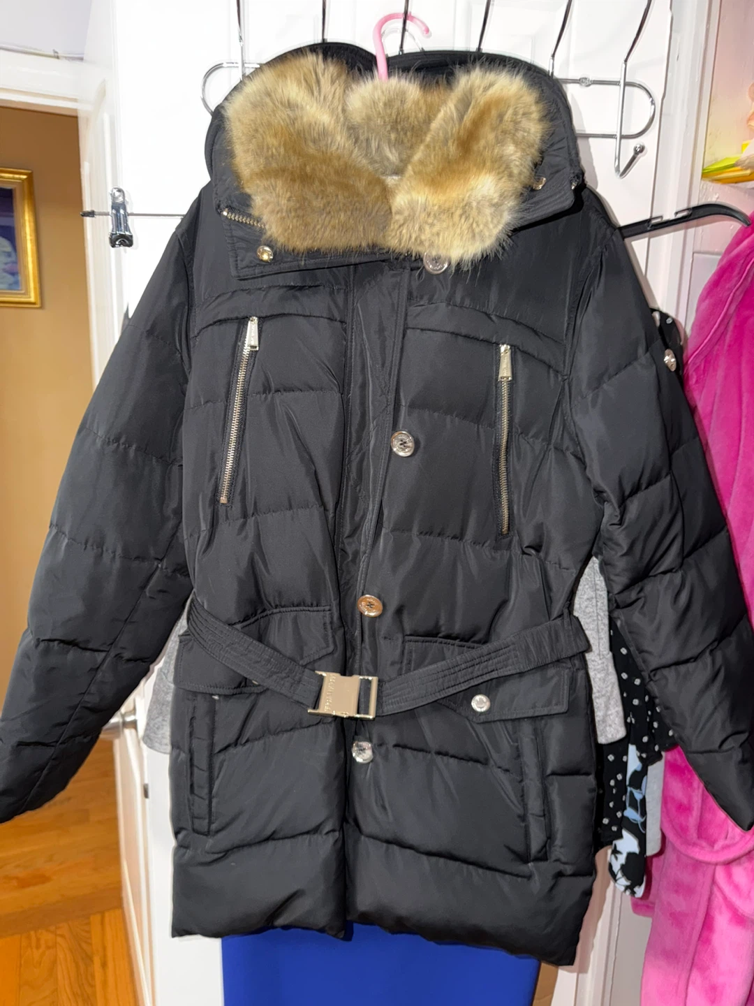 Black puffer parka with gold-tone hardware and a detachable fur-lined hood. It's a stylish and warm winter coat. Features a belted waist and multiple pockets.