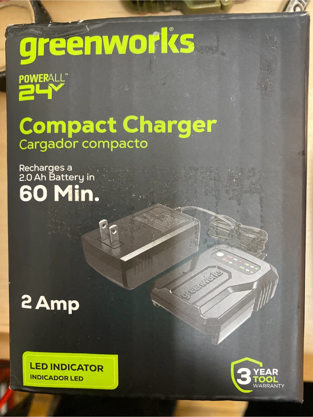 Selling a Greenworks POWERALL 24V compact charger. It recharges a 2.0 Ah battery in 60 minutes and has an LED indicator. It is a 2 Amp charger and comes with a 3 year tool warranty. OPEN BOX .