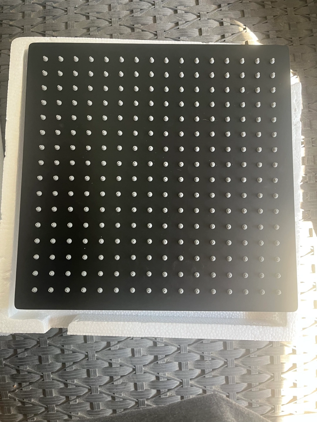 I'm selling a black square shower head. It's 12 inches in size and ready to install in your bathroom!