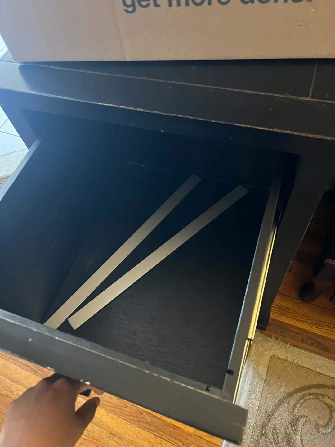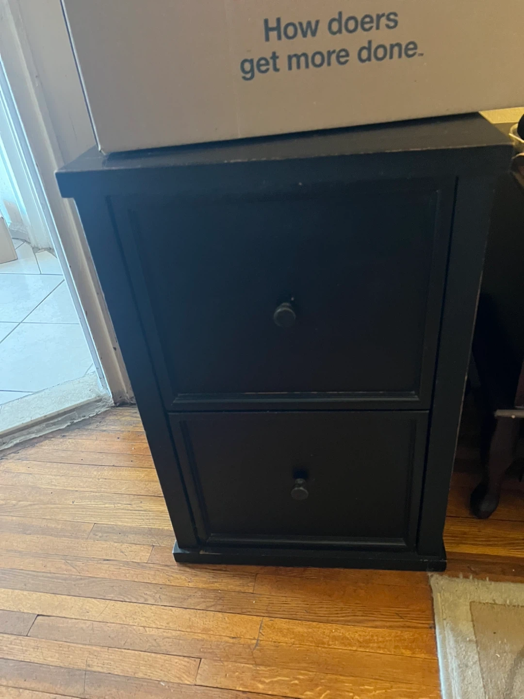 Selling a black two-drawer filing cabinet. It's perfect for keeping your documents organized at home or in the office. It has a classic look that fits in with most decor styles. The drawers slide smoothly for easy access to your files