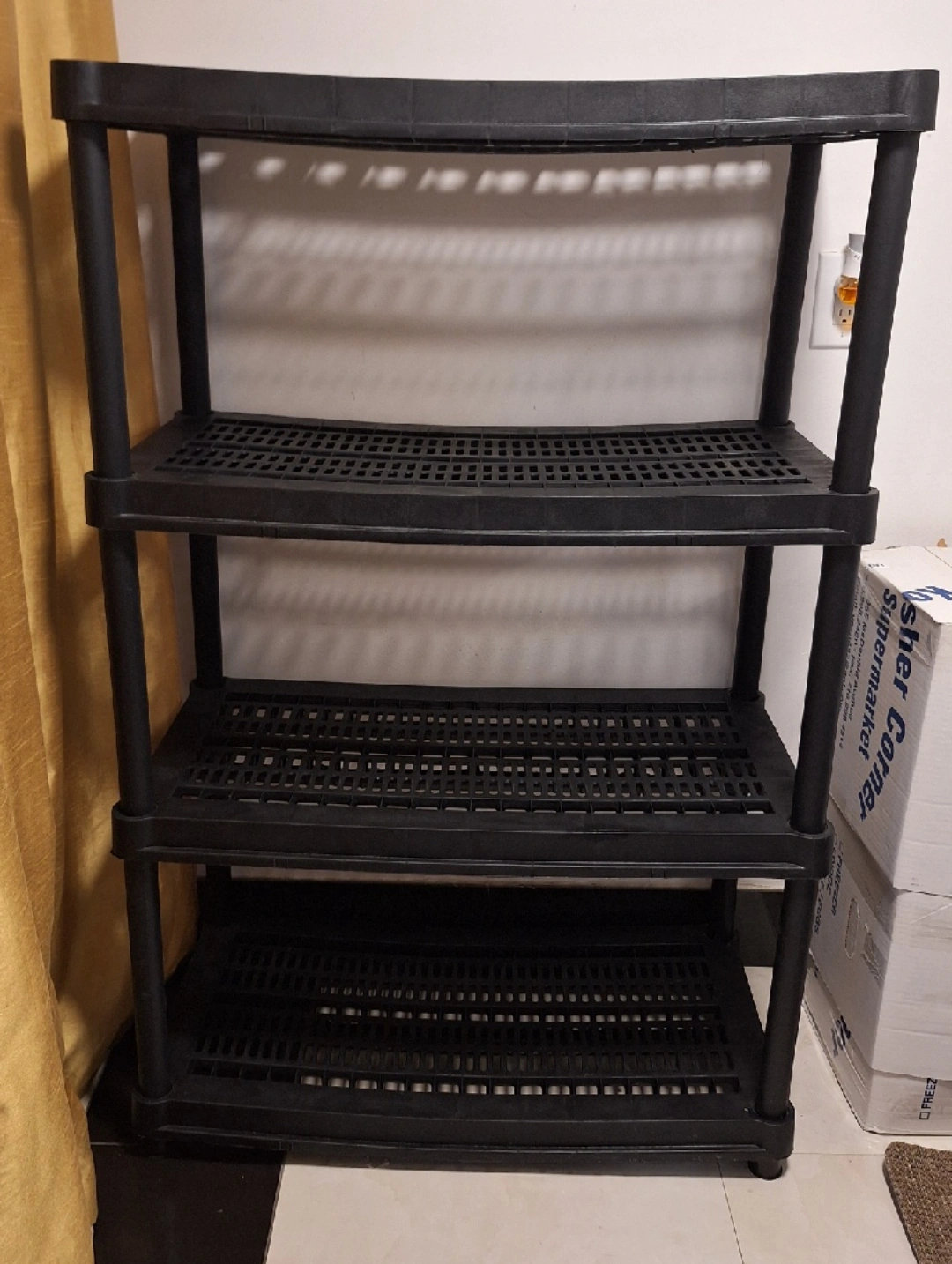 Here's a sturdy black 4-tier shelving unit, perfect for organizing your space! It's in great shape and ready to hold your items. This shelving unit is made of durable plastic material.