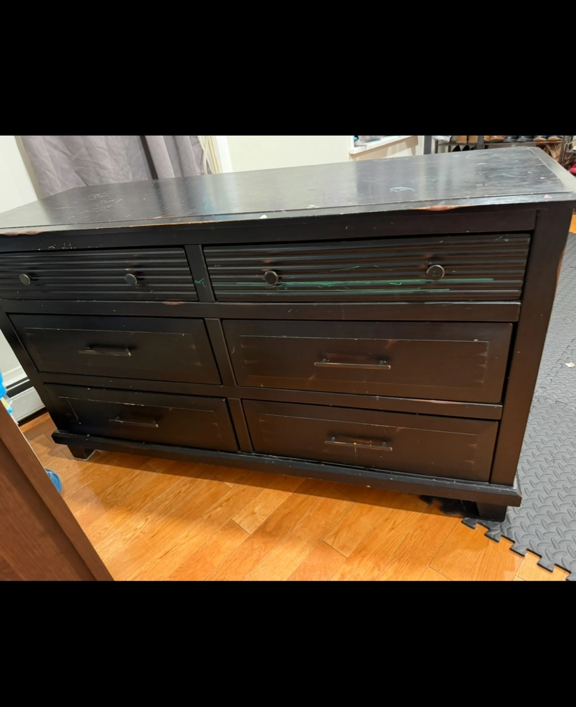 20Dark wood dresser. Six drawers. Some minor scratches and scuffs. Small hole in the back can easily be fixed