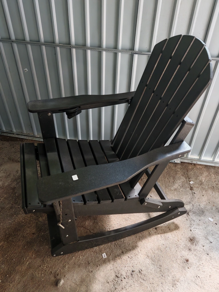 65Selling a black Adirondack rocking chair. It's perfect for relaxing on the porch or in the backyard. This chair features a comfortable design and smooth rocking motion. It's made of durable material that can withstand the elements, so you can enjoy it for years to come
