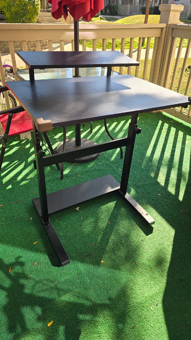 Selling a black adjustable height standing desk. It's in good condition and perfect for setting up a home office or study space. The desk has a two-tier design and a sturdy metal frame.