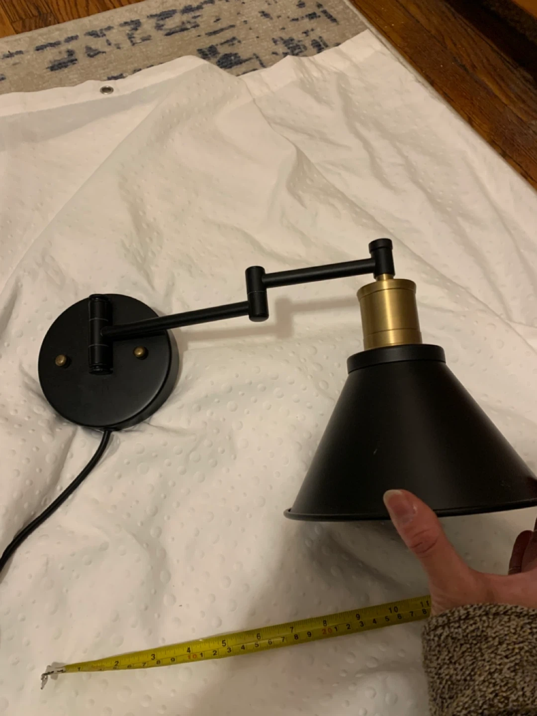 68I'm selling a black adjustable wall sconce! It's in great condition and would be perfect for adding some stylish lighting to any room. The sconce is adjustable, so you can easily direct the light where you need it. It measures approximately 10 inches in diameter