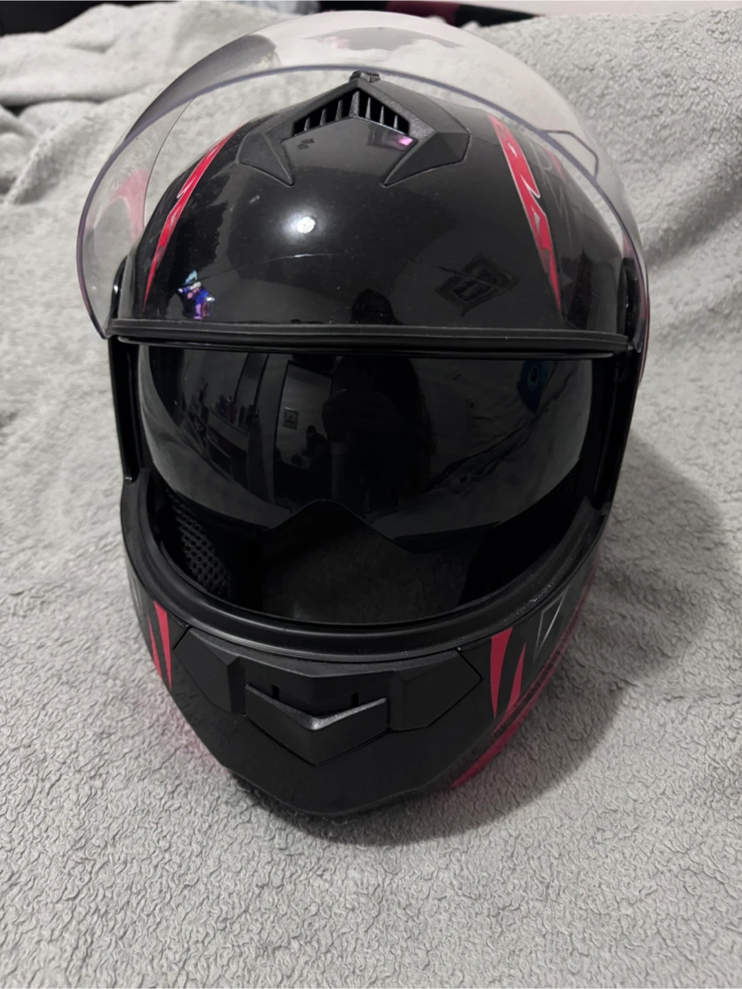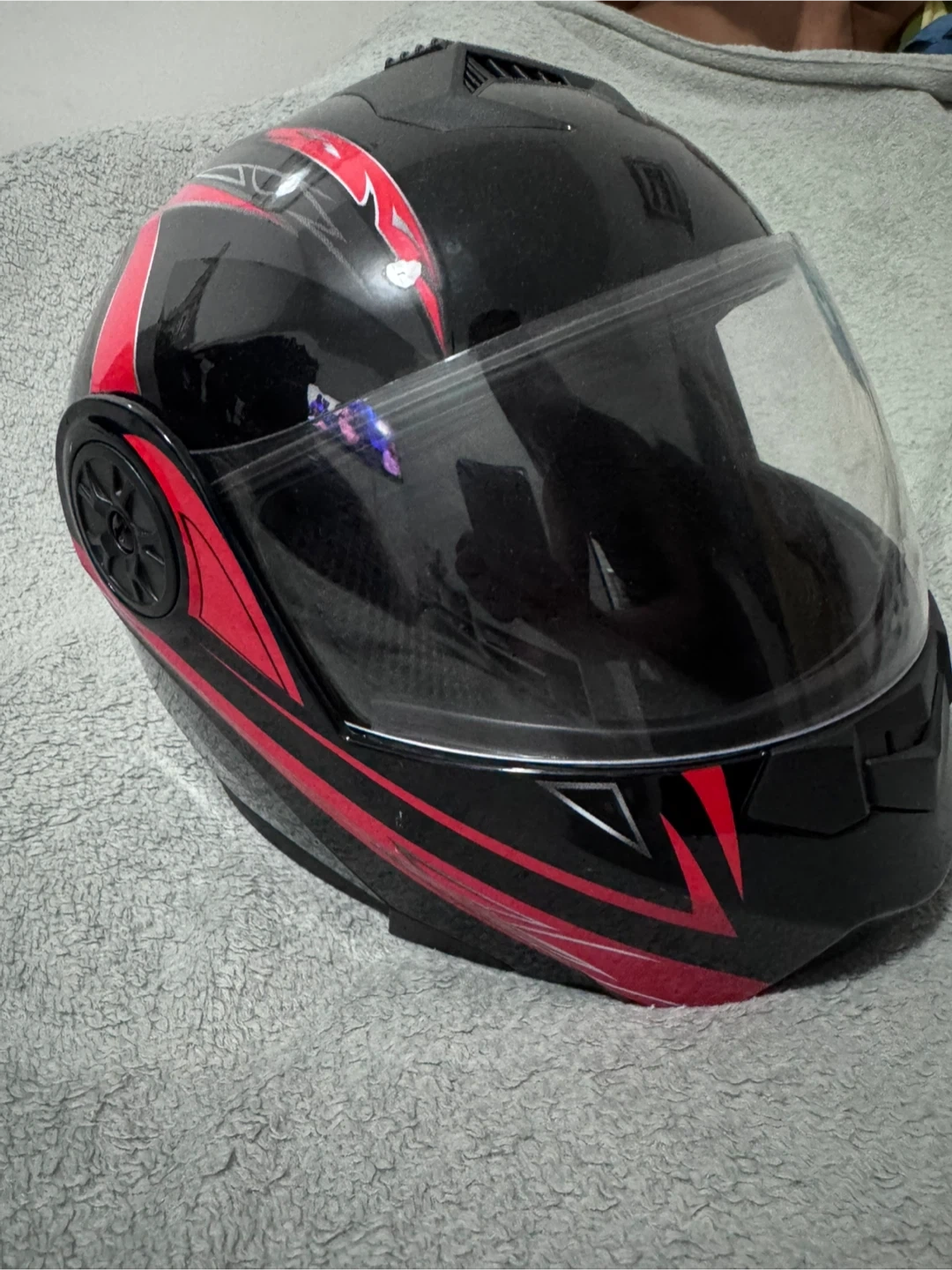 Selling a motorcycle helmet in black and red. It looks to be in good condition with a clear visor. Perfect for riding!