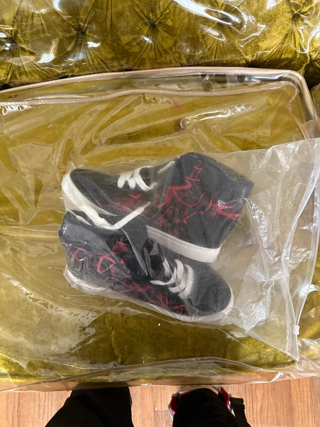 Selling a pair of black and red sneakers. They are in good condition and come in the original packaging