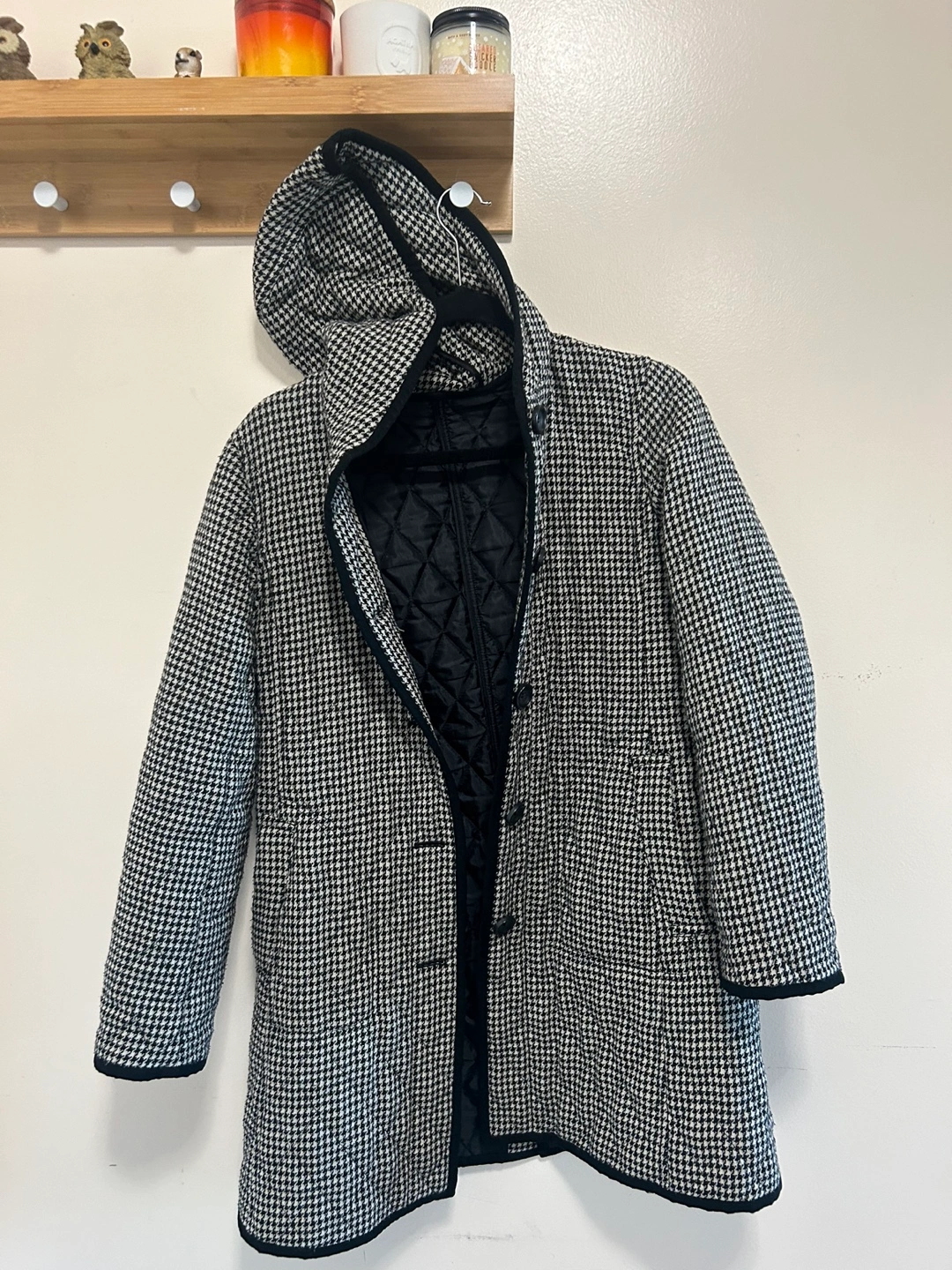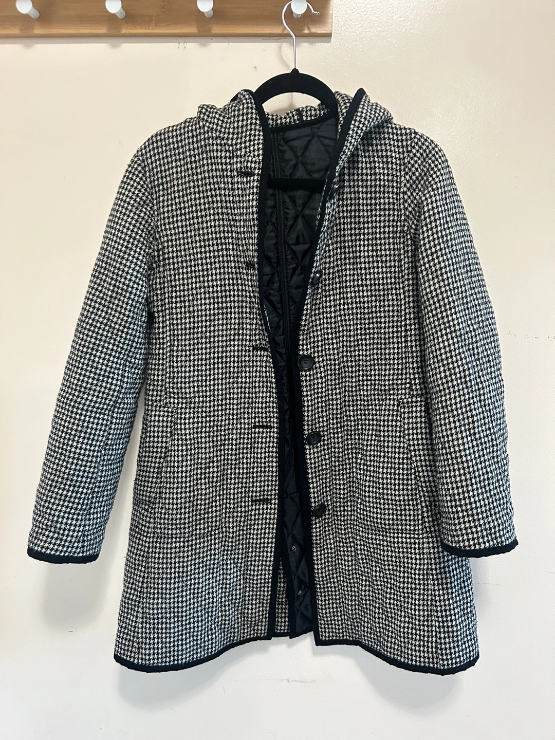 79Black and white houndstooth hooded coat with black trim. Lined with black quilted fabric. Has two front pockets.