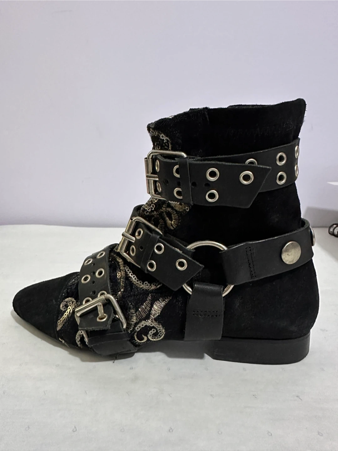 10Selling a pair of black ankle boots in size 36. They feature a unique design with multiple straps and silver hardware. Perfect for adding a bit of edge to your outfit! Made in Spain Worn once