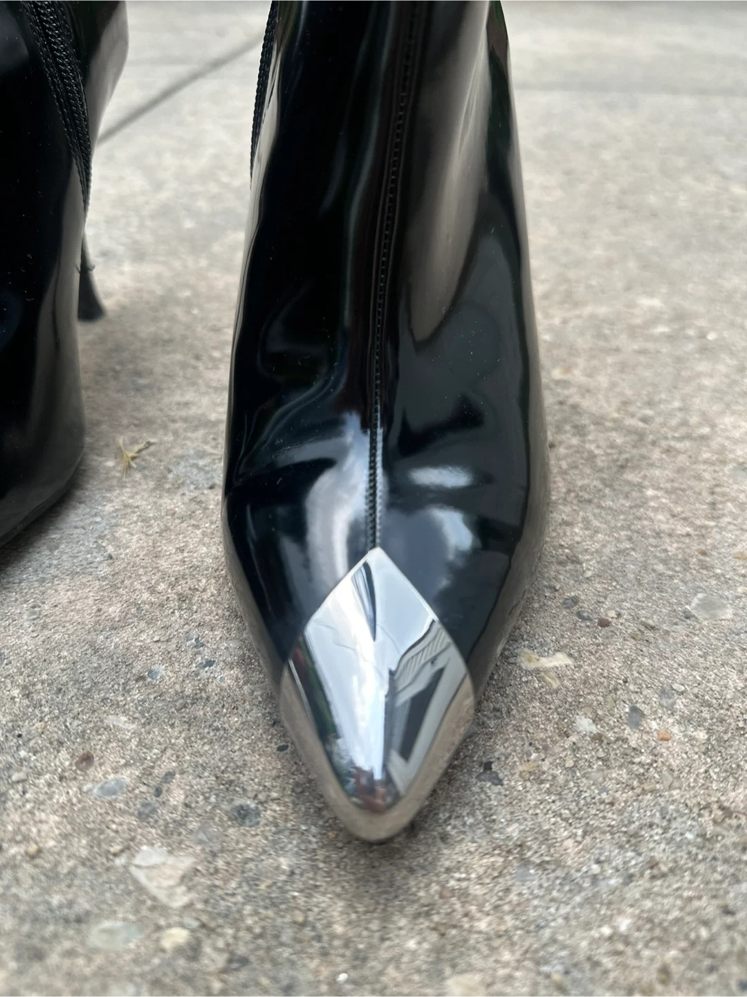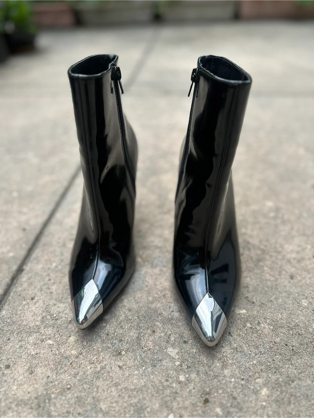 10Selling a pair of stylish black ankle boots! They feature a sleek, shiny finish and a distinctive silver toe cap. These boots are in great condition and ready to add a touch of elegance to your wardrobe Size 8