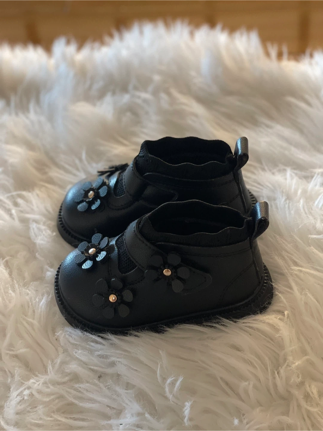 0These adorable black baby girl shoes are in great condition and feature cute flower details! They're perfect for dressing up any outfit and are sure to make your little one look even more precious
