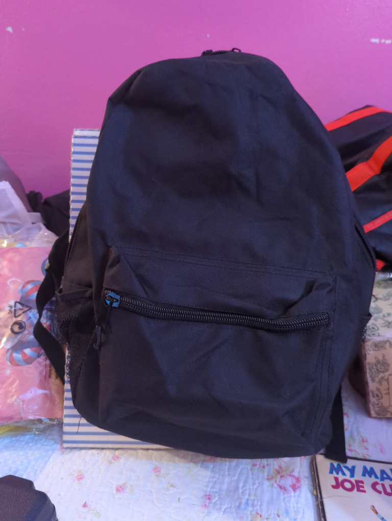 I'm selling a simple black backpack. It's a great size for everyday use and has a zippered front pocket for easy access to your essentials. The inside has some compartments to help keep things organized🧡