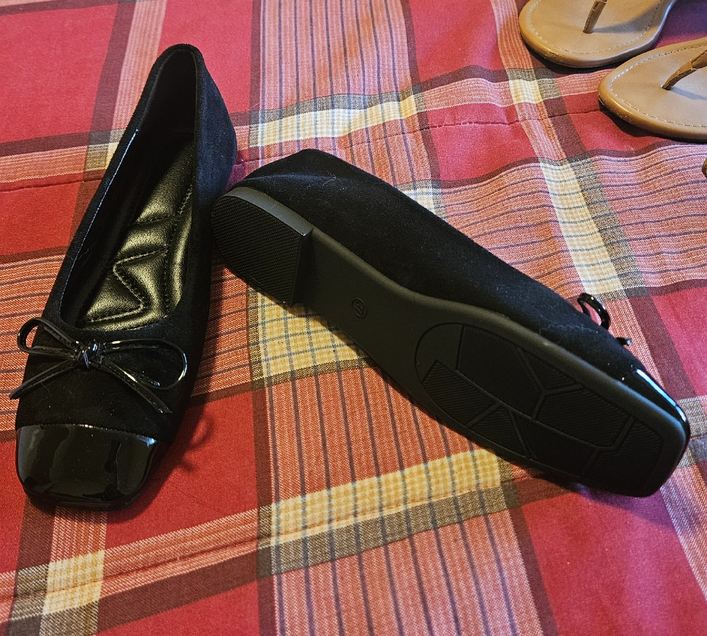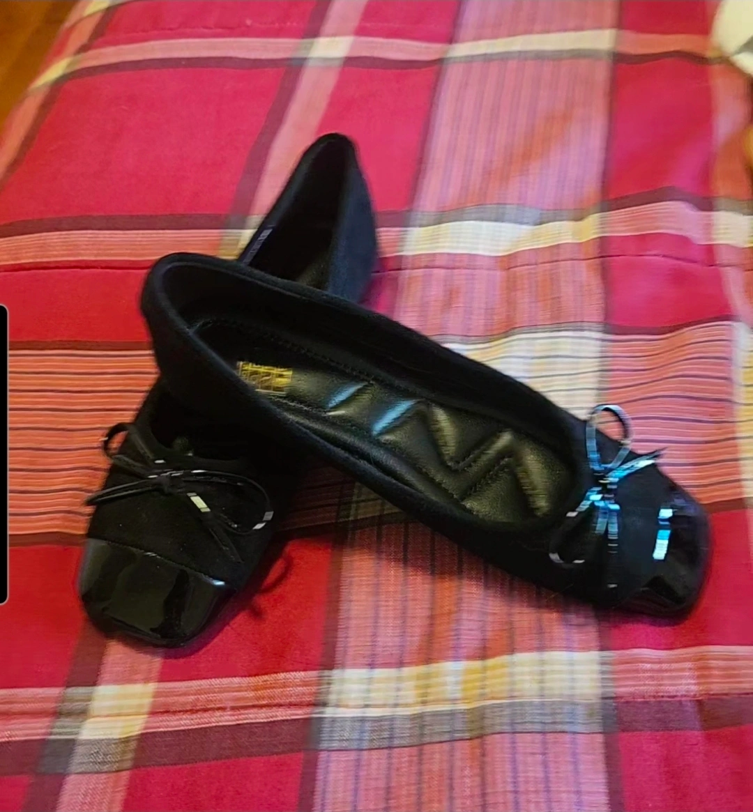 65These cute black ballet flats feature a patent leather toe and a sweet little bow! They're perfect for dressing up or down and are in great condition