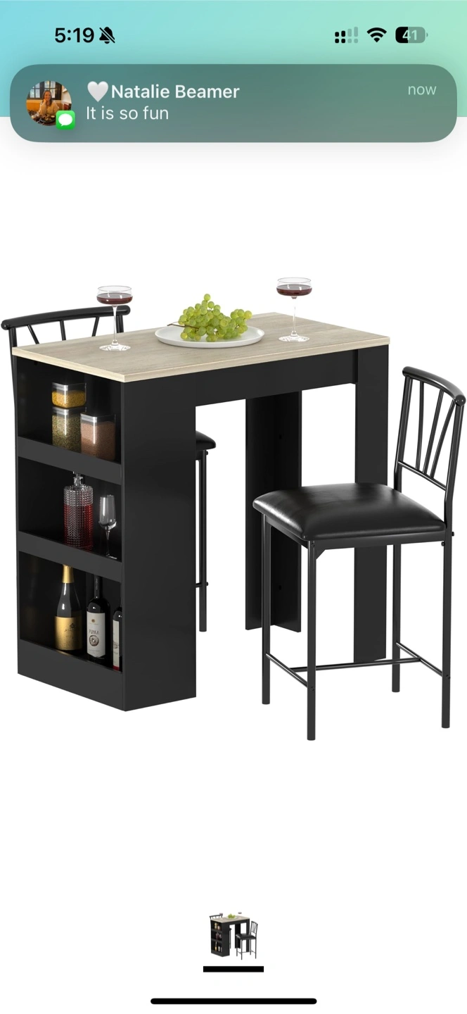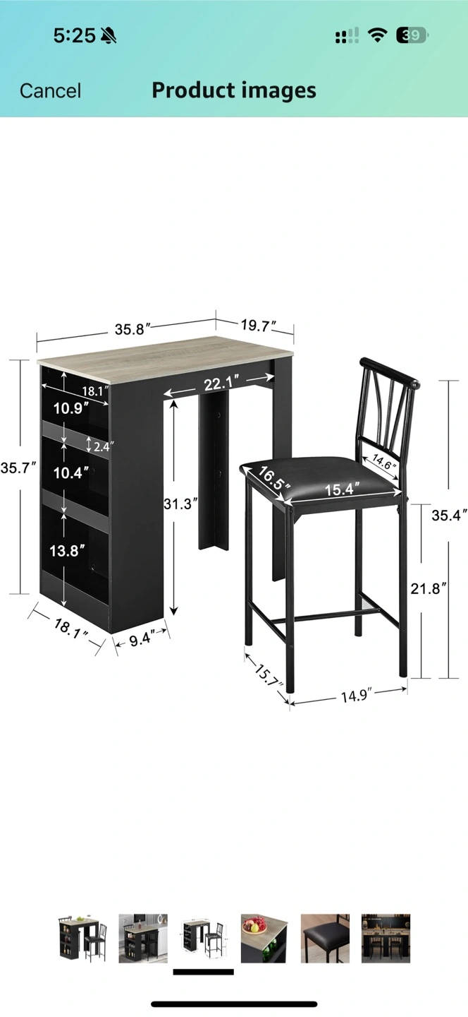 Looking to sell this bar table with two chairs! It's perfect for a small space or breakfast nook. The table features built-in shelving on one side for storage. The dimensions are approximately 35.8" x 19.7" x 35.7" for the table, and 16.5" x 15.4" x 35.4" for the chairs