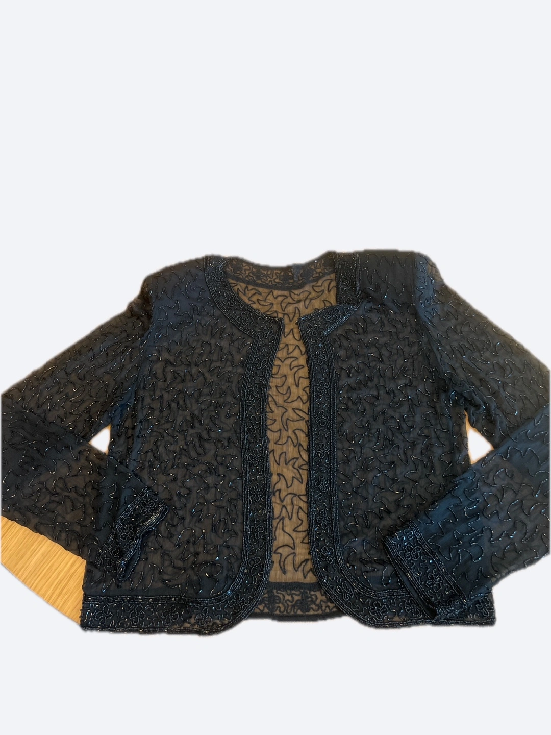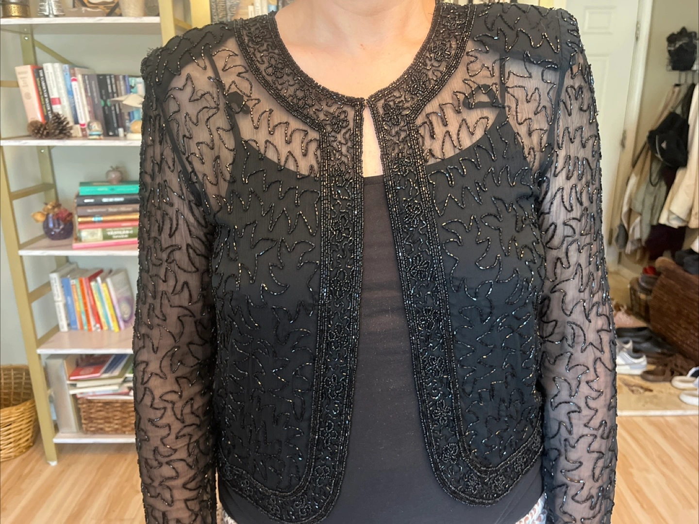 Selling a beautiful black bolero jacket with intricate beadwork. It's perfect for layering over a dress or top for a special occasion or a night out. The jacket is in great condition (worn only once) and adds a touch of elegance to any outfit!
