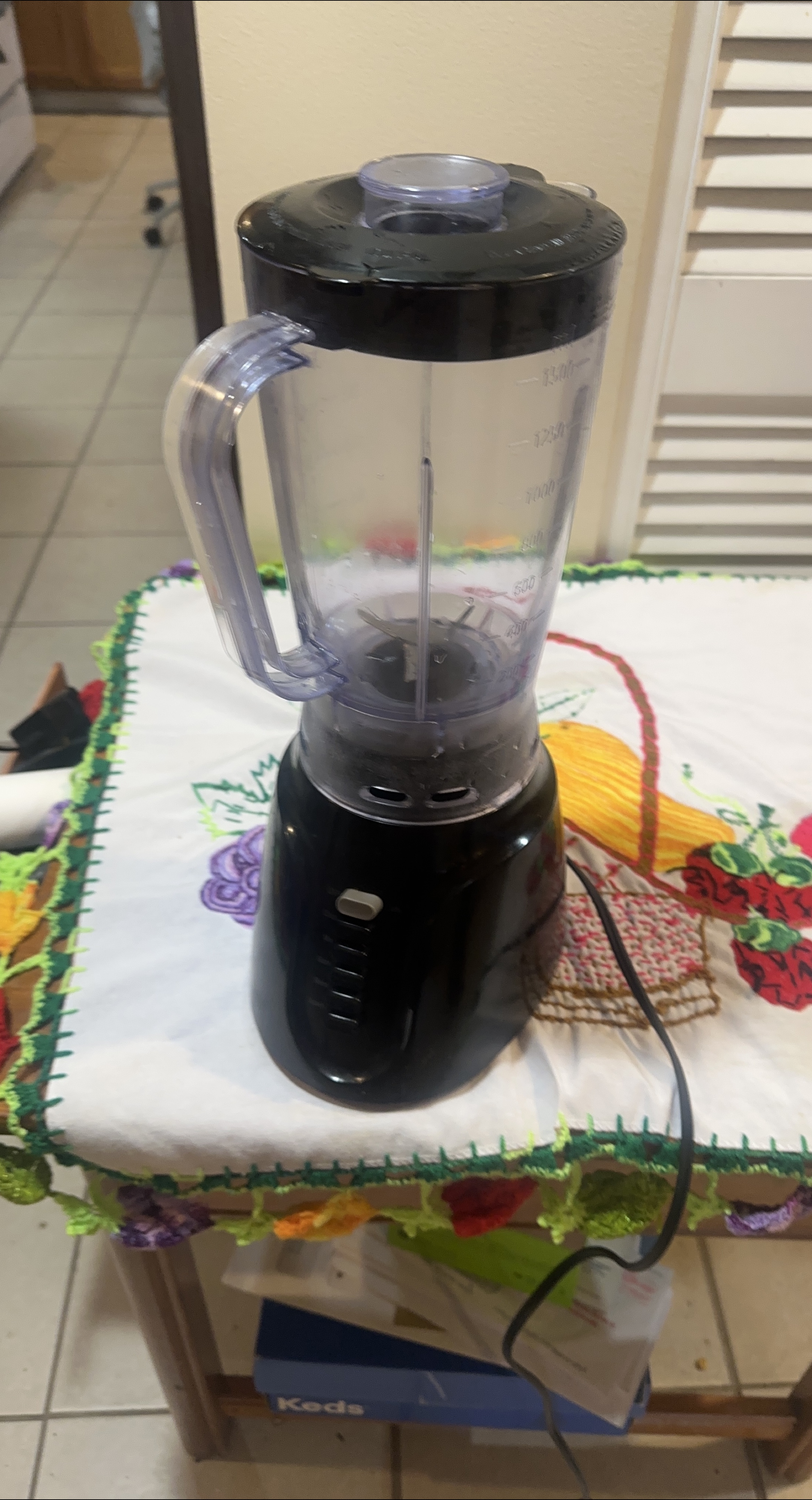 Selling a black blender in good condition! It's perfect for making smoothies or other blended drinks. It has a clear pitcher with measurements on the side.