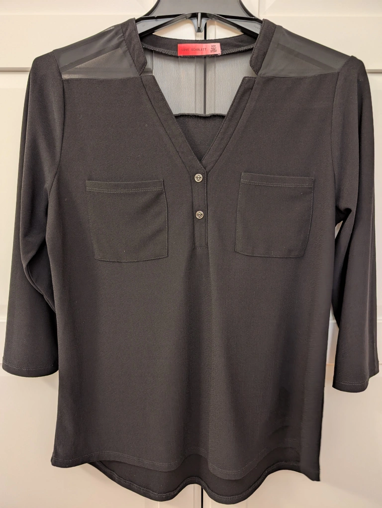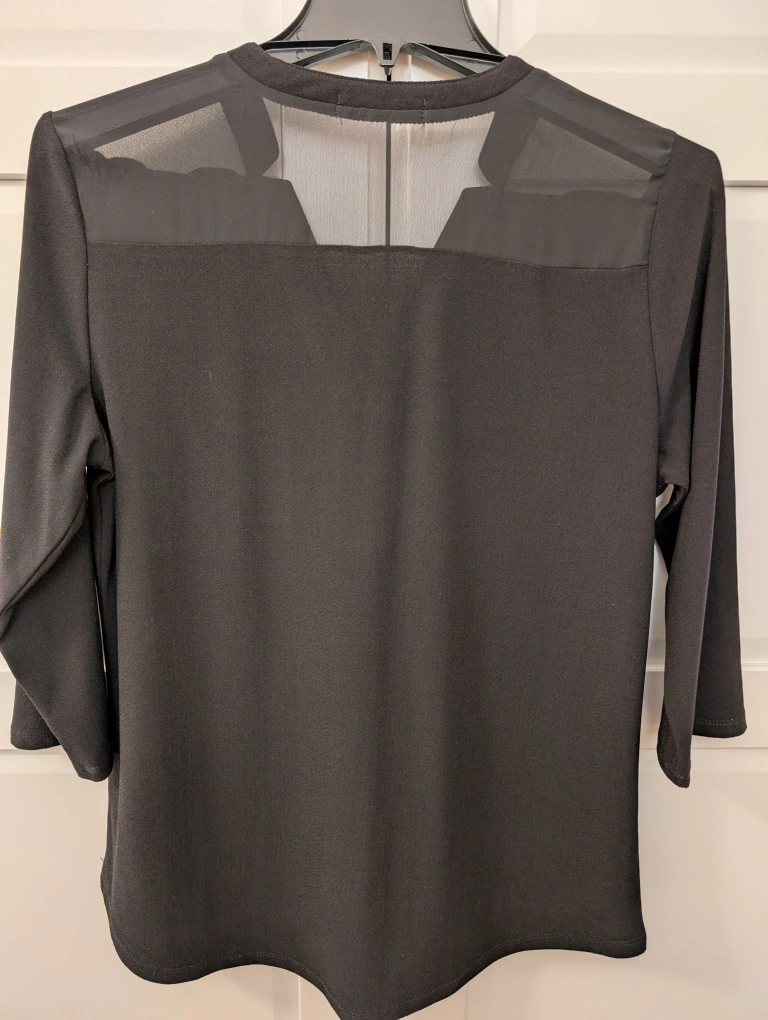 20Black blouse, with a V-neck. Has two small pockets and a sheer panel on the shoulders and upper back. The sleeves are three-quarter length. This would be an excellent addition to your wardrobe for a business meeting.