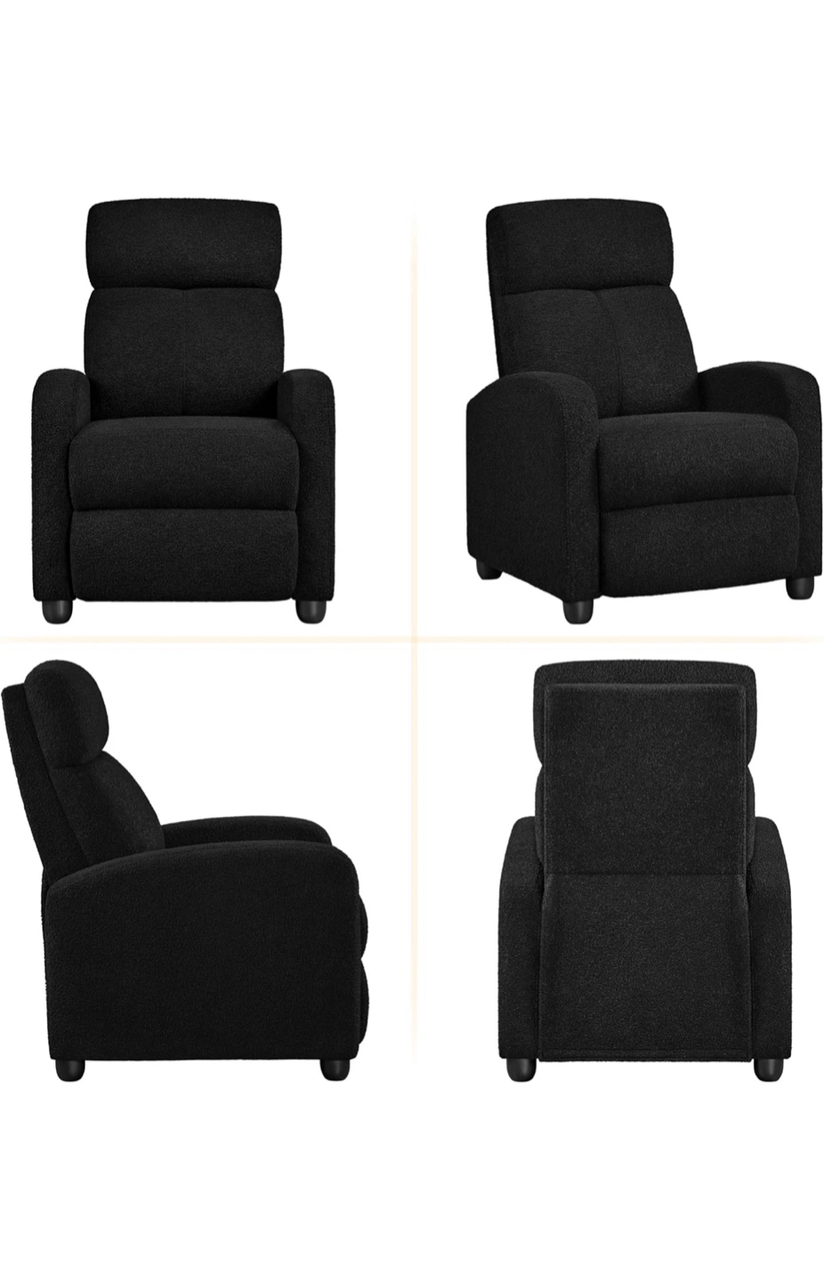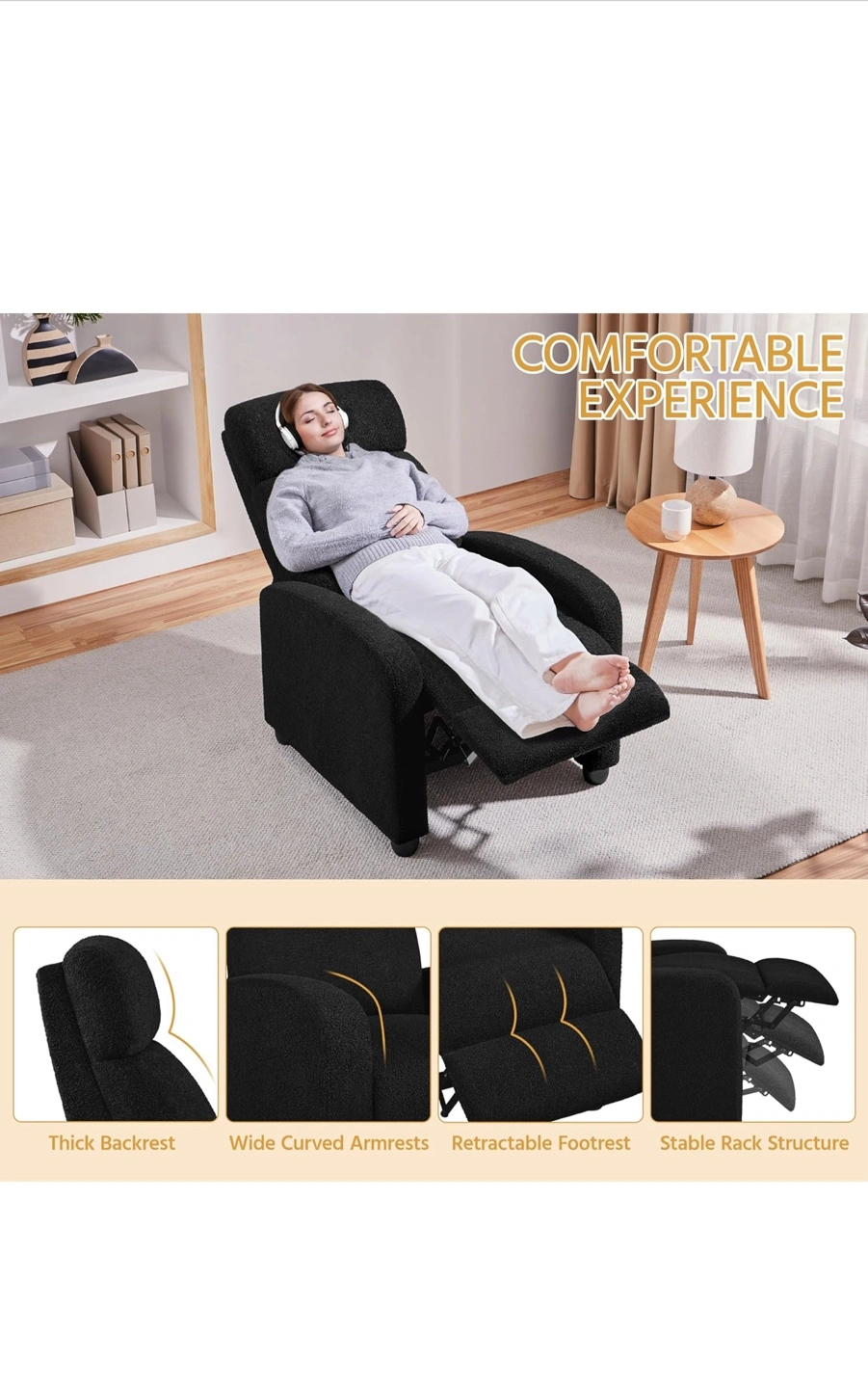 The package has been opened but has not been used. It is delivered assembled or disassembled. This recliner features a smooth, fluffy boucle upholstery that's durable and comfortable! It has a thick backrest, wide curved armrests, and a retractable footrest. Enjoy a comfortable experience while taking a rest, watching TV, or napping or lashista